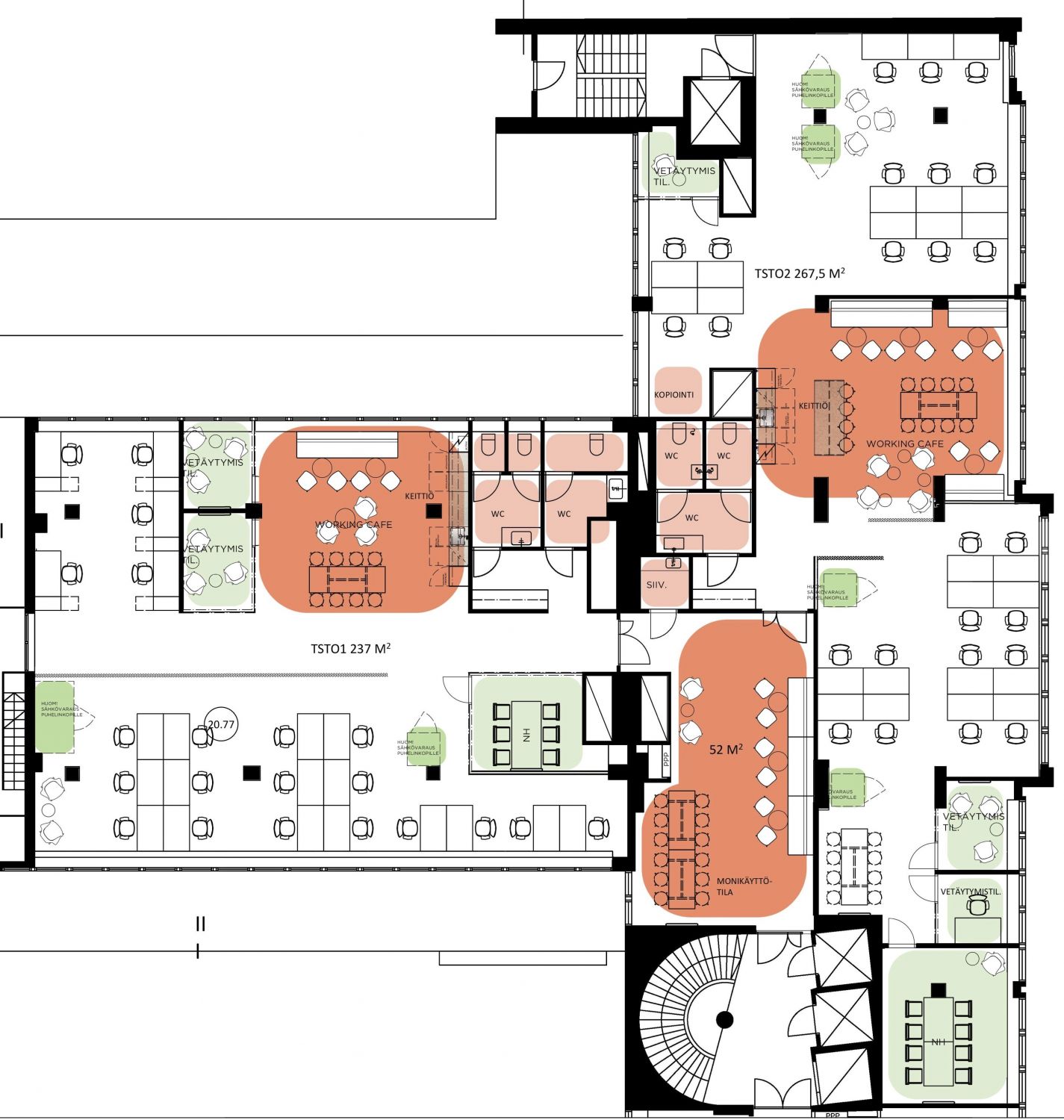 Työpisteiden lukumäärä perustuu havainnekuvaan tehtyyn luonnokseen. Käyttäjä voi itse sijoittaa tilaan haluamansa määrän työpisteitä.