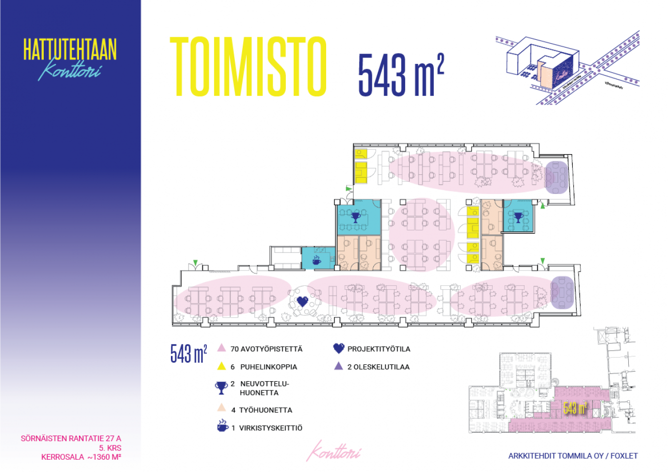 Saneerattu 543 m² toimistotila Sörnäisissä Hattutehtaan Konttorin 5. kerroksessa.