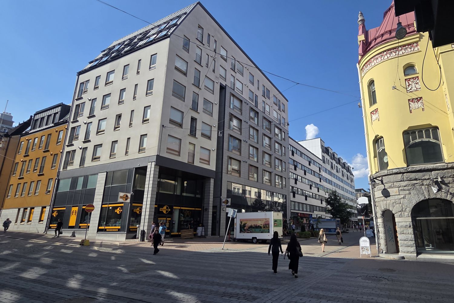 Uudisrakennus kävelykadulla Kauppakadun kulmassa.