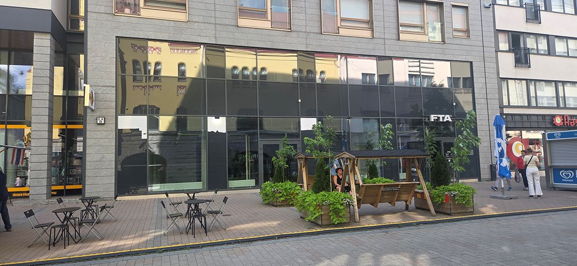 Tilan ikkunat kohti kävelykatua vilkkaalla sijainnilla.