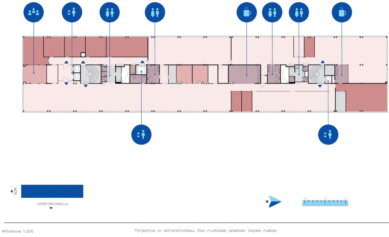 Toimisto koostuu avotilasta, työ-/neuvotteluhuoneista sekä kahdesta erillisestä taukotilasta. Tilaa voidaan muokata tarpeiden mukaisesti.