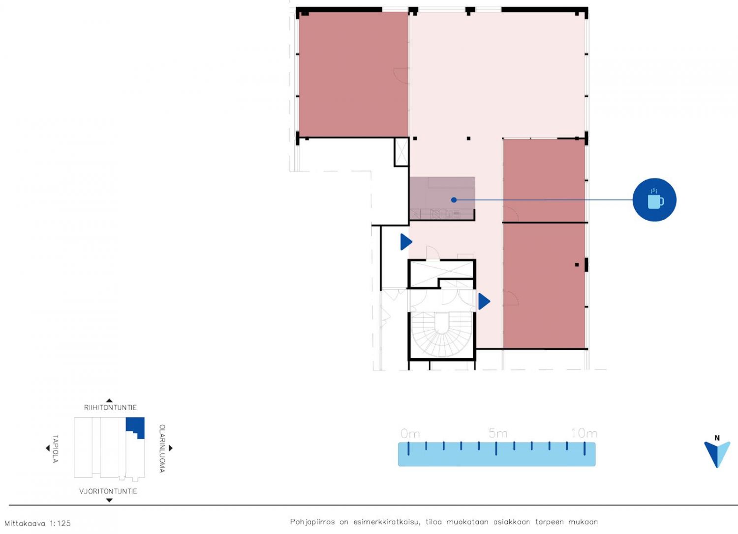 Toimisto koostuu avotilasta, työ-/neuvotteluhuoneista sekä erillisestä taukotilasta. Tilaa voidaan muokata tarpeiden mukaisesti.