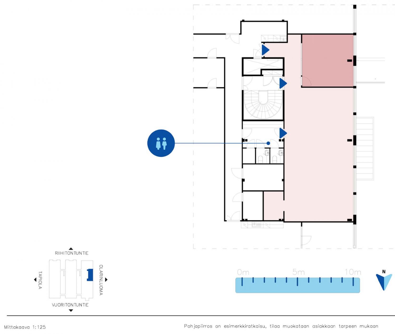 Toimisto koostuu avotilasta sekä työ-/neuvotteluhuoneesta. Tilassa ei ole omia wc tai keittiötiloja, mutta vuokralaisella on kiinteistön yhteiskäytössä olevien wc tai keittiötilojen käyttöoikeus. Tilaa voidaan muokata tarpeiden mukaisesti.
