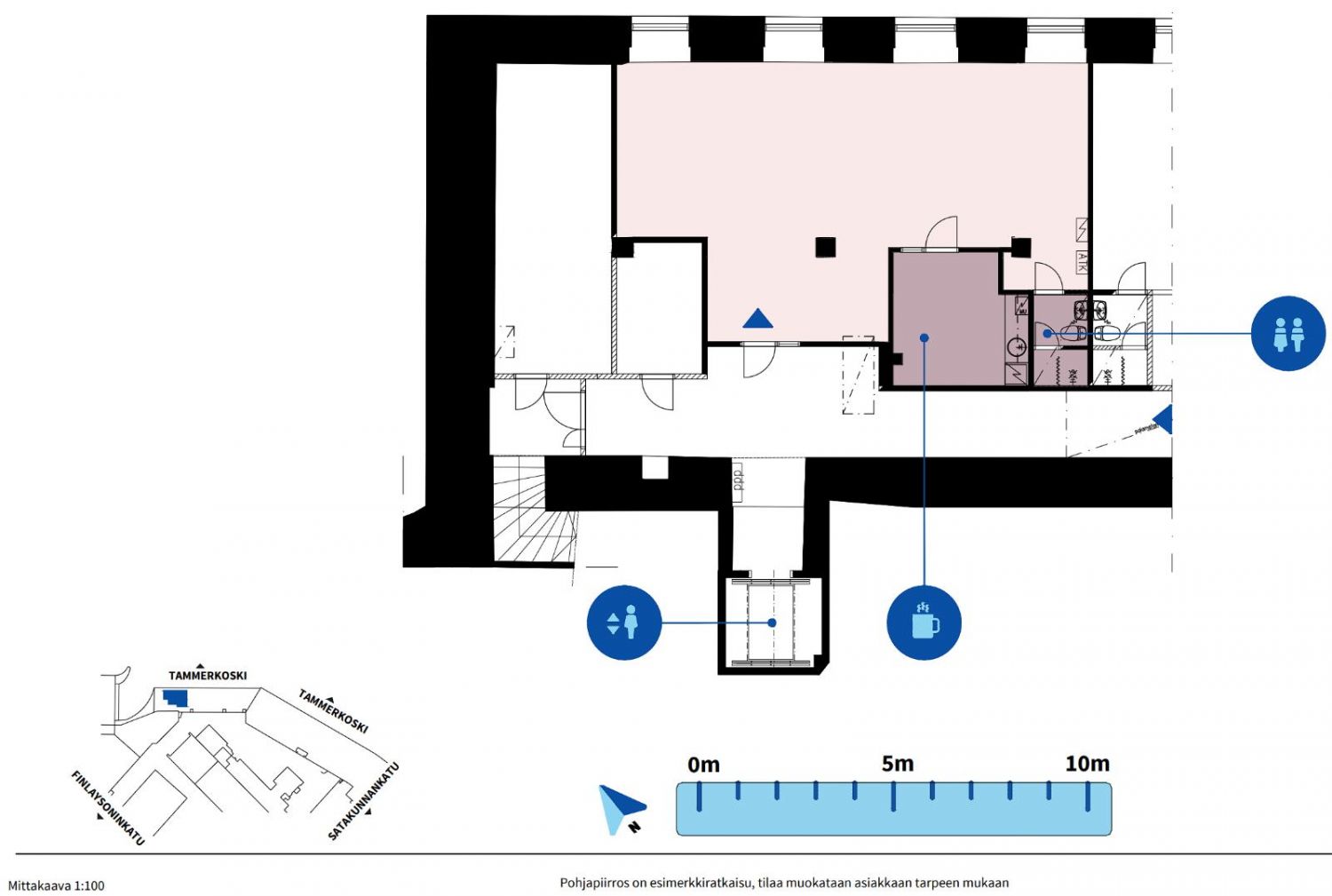 Toimisto koostuu avotilasta, erillisestä keittiöllisestä taukotilasta sekä wc tiloista. Tilaa voidaan muokata tarpeiden mukaisesti.
