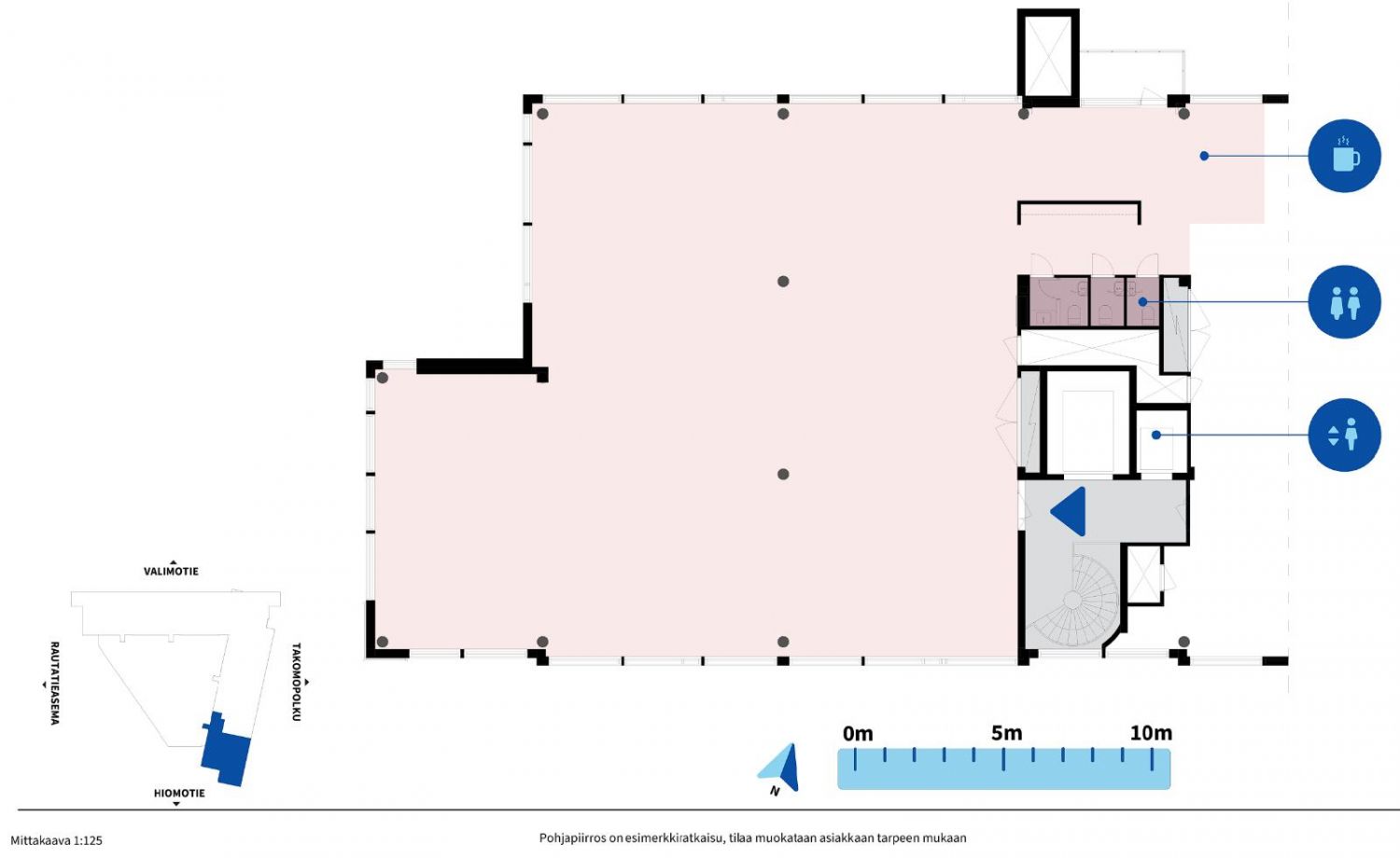 Toimisto koostuu avarasta avotilasta, työ-/neuvotteluhuoneista sekä erillisestä keittiöllisestä taukotilasta. Tilaa voidaan muokata tarpeiden mukaisesti.
