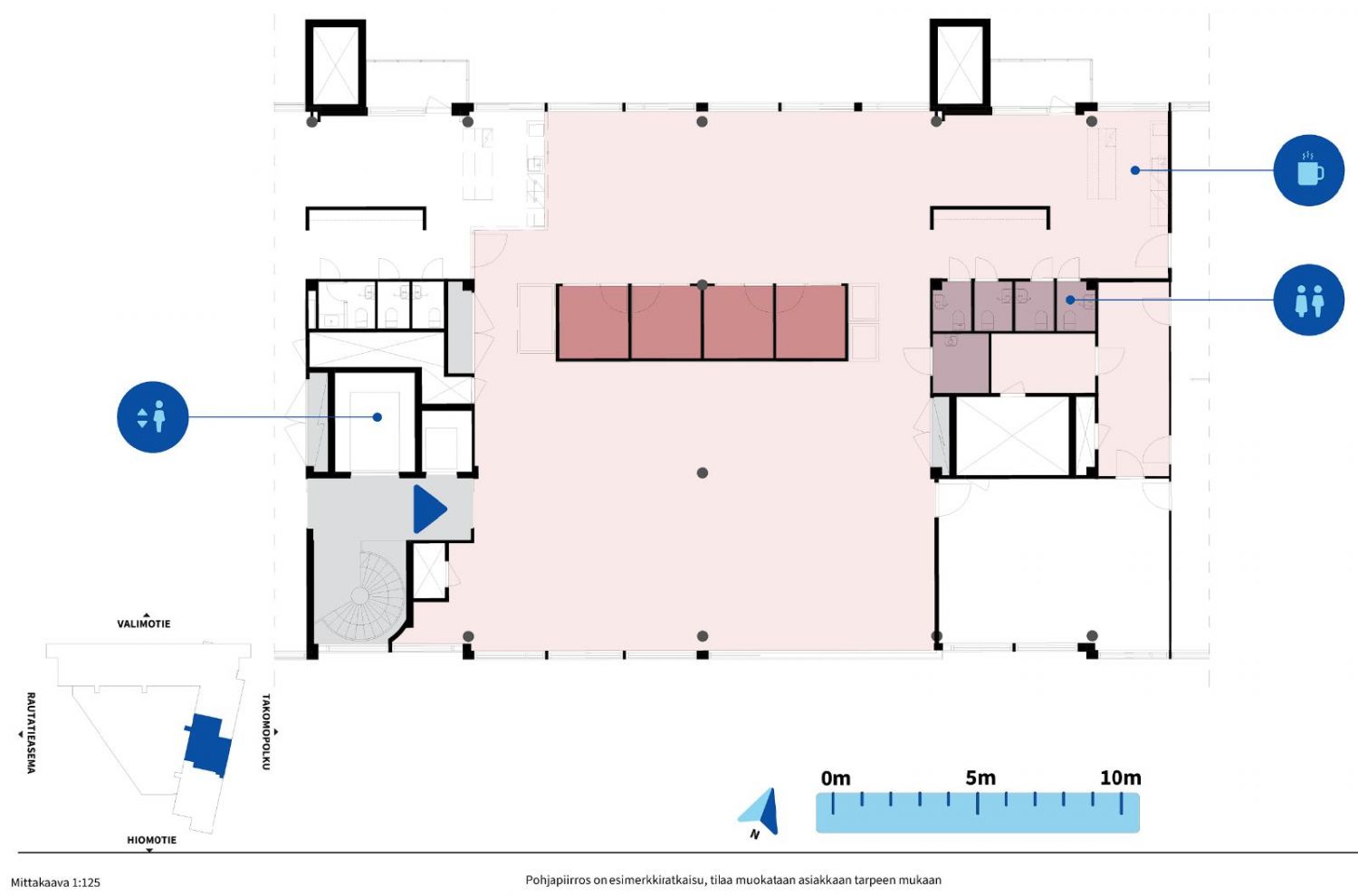 Toimisto koostuu avarasta avotilasta, työ-/neuvotteluhuoneista sekä erillisestä keittiöllisestä taukotilasta. Tilaa voidaan muokata tarpeiden mukaisesti.