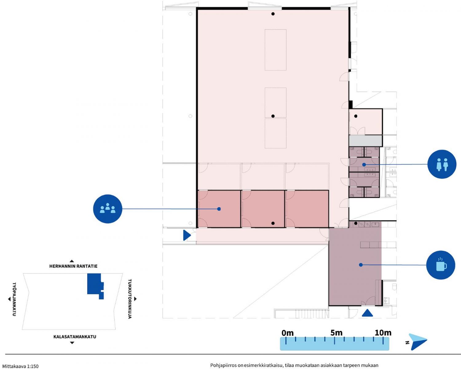 Toimisto koostuu avotilasta, työ-/neuvotteluhuoneista sekä erillisestä keittiöllisestä taukotilasta. Tilaa voidaan muokata tarpeiden mukaisesti.