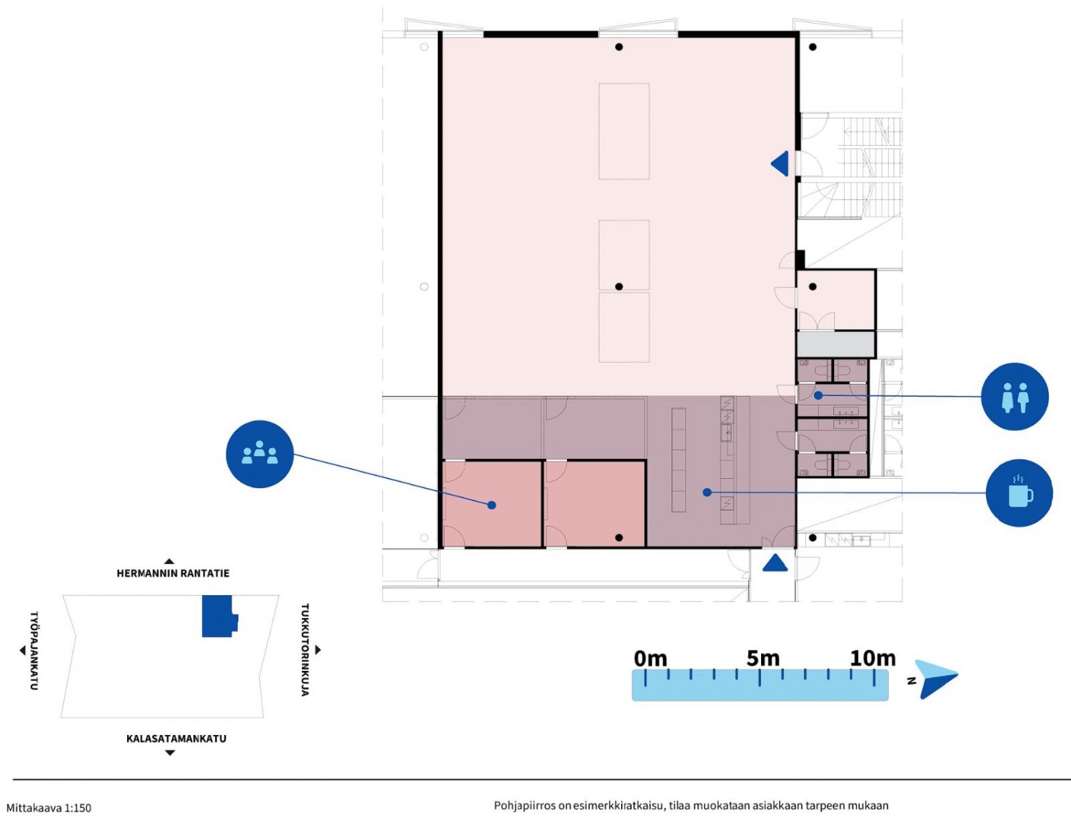 Toimisto koostuu avotilasta, työ-/neuvotteluhuoneista sekä erillisestä keittiöllisestä taukotilasta. Tilaa voidaan muokata tarpeiden mukaisesti.