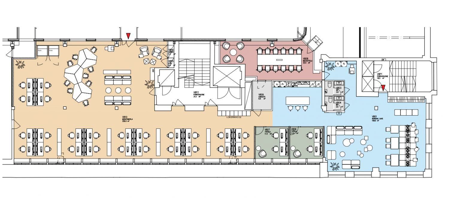 Toimisto koostuu avotilasta, työ-/neuvotteluhuoneista sekä erillisestä keittiöllisestä taukotilasta. Tilaa voidaan muokata tarpeiden mukaisesti.