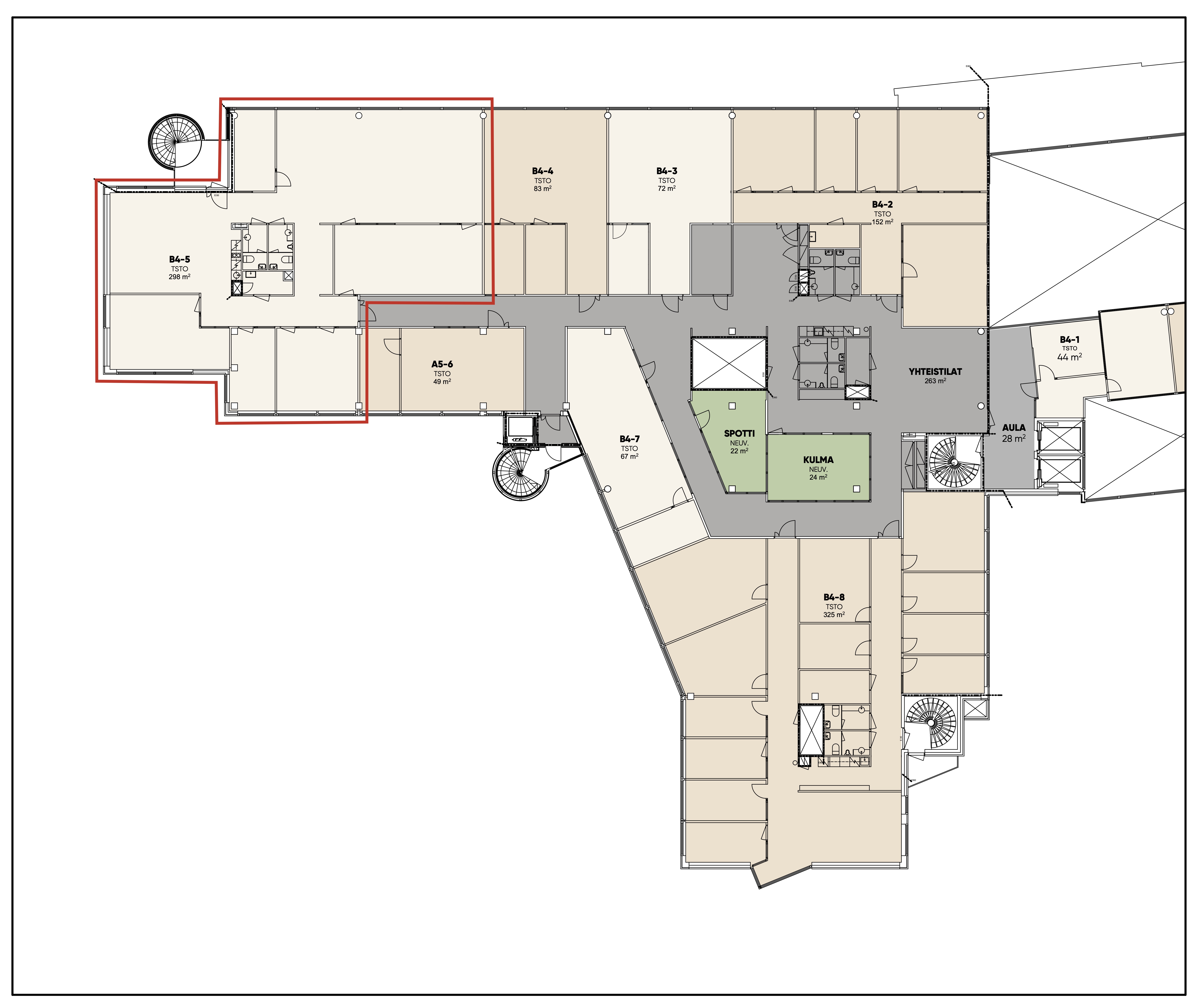 Toimistohuoneistojen pinta-alat vaihtelevat noin 40 neliön pientoimistoista 1 460 neliön koko kerroksen tiloihin. Huoneistot ovat muunneltavissa vuokralaisen työskentelytapaan sopivaksi. Sisäpihan toimistoista voi ihailla rauhoittavaa metsämaisemaa, kun taas Huopalahdentien puolen tiloissa voi kylpeä valossa. Kiinteistössä on myös erillisiä neuvottelutiloja.