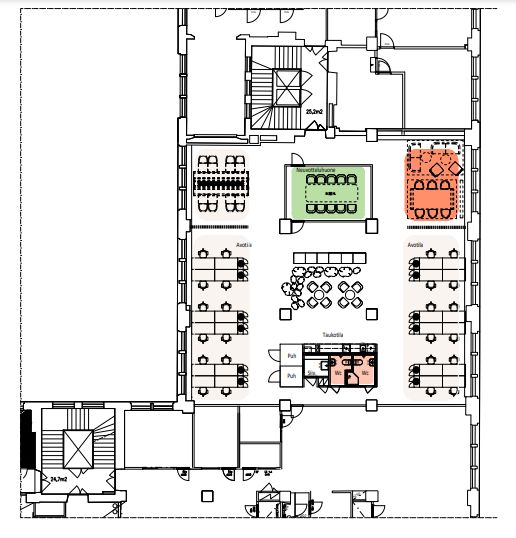 Vuokrattavana kolmannen kerroksen valoisaa toimistotilaa. Tilassa on muutamia työhuoneita, avotilaa, oma keittiö ja sosiaalitilat.