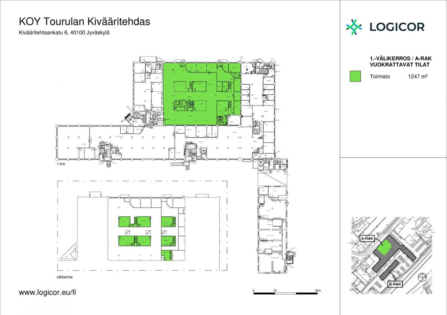 Vuokrataan Jyväskylän Tourulasta katutasossa 1 247 m² jäähdytettyä toimisto-/liiketila. Parvitilojen osuus kokonaisuudesta on noin 224 m²