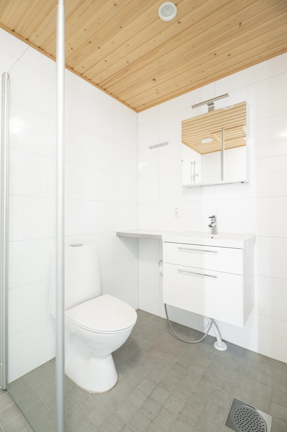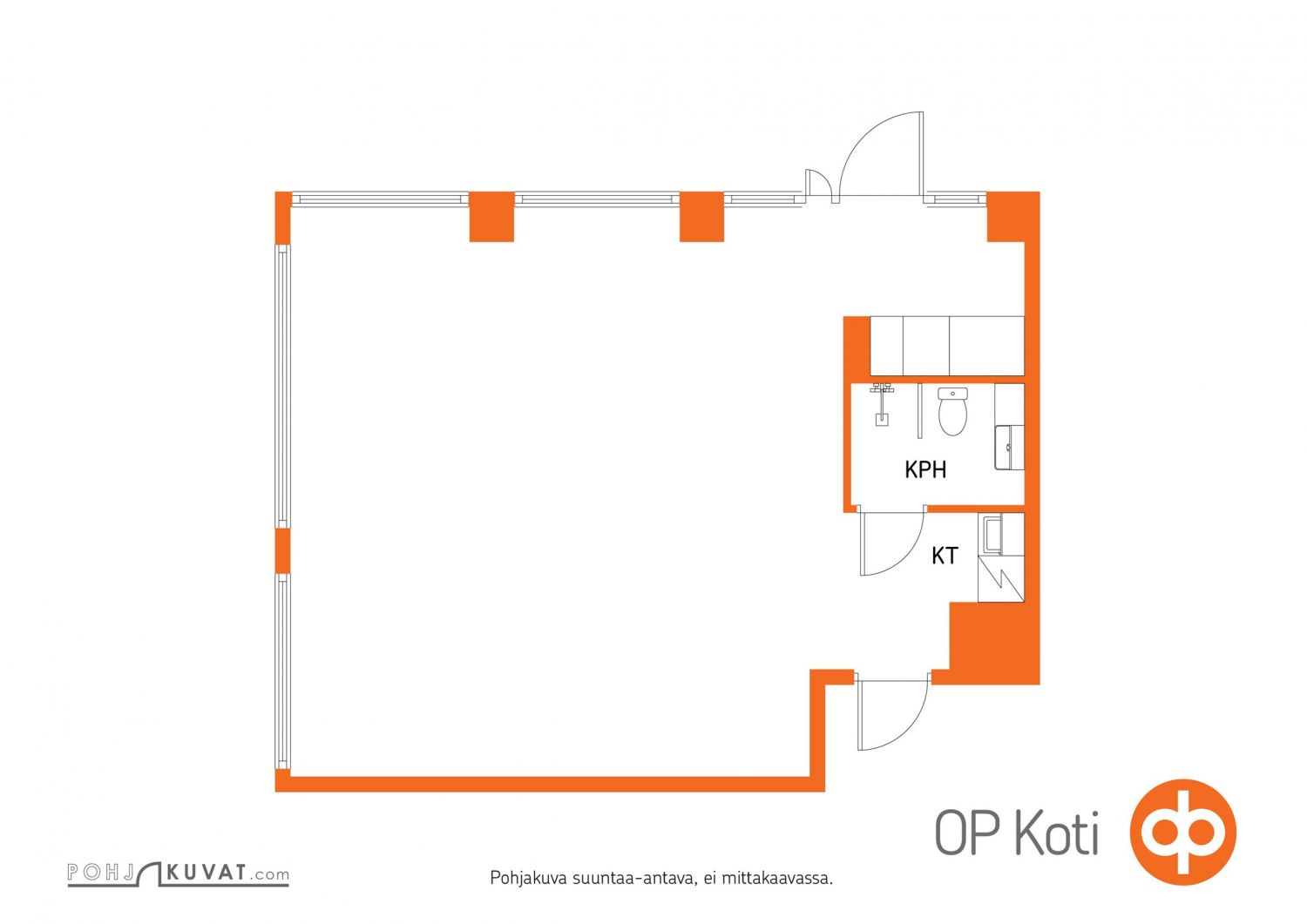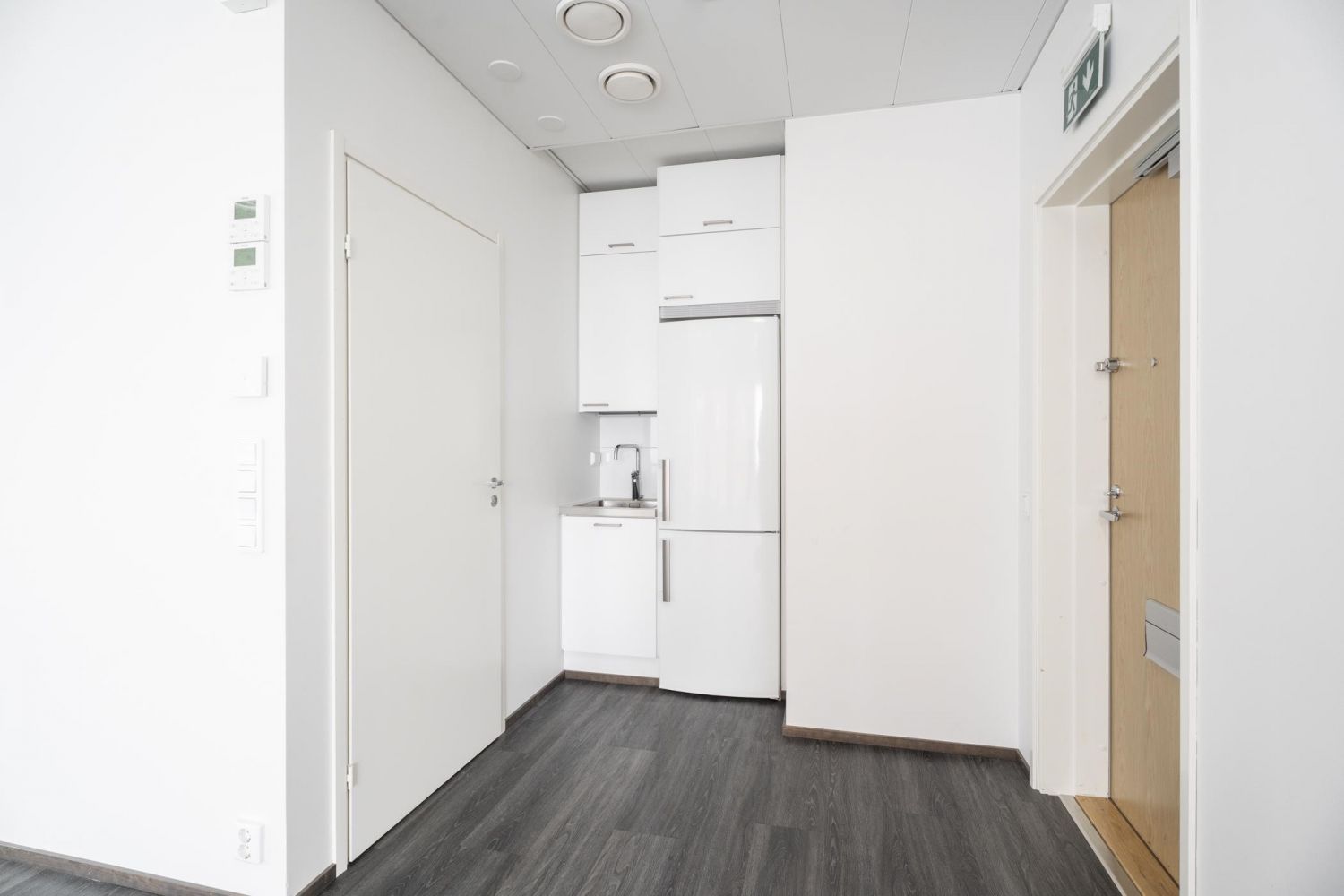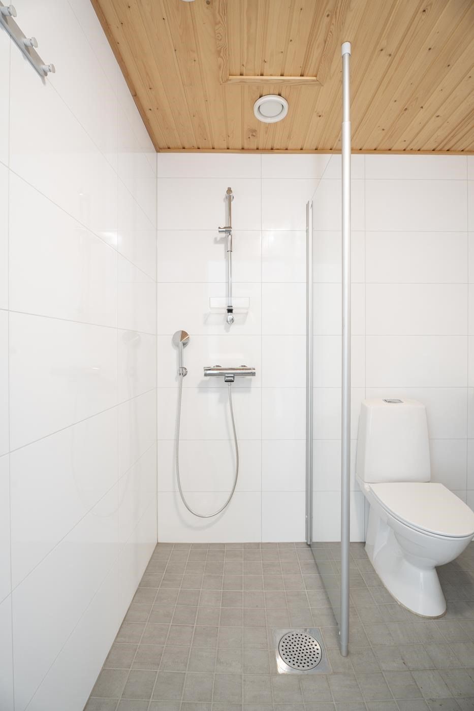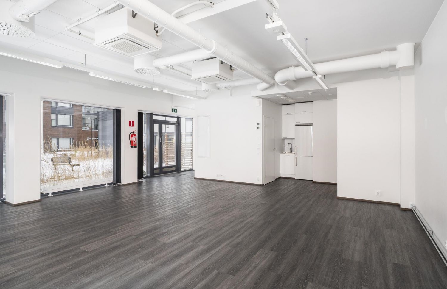 Liiketila on yksi iso avotila, peränurkassa rappukäytävän sisäänkäynnin yhteydessä on kunnollinen kylpyhuone suihkulla ja pieni keittonurkka jääkaappipakastimella.