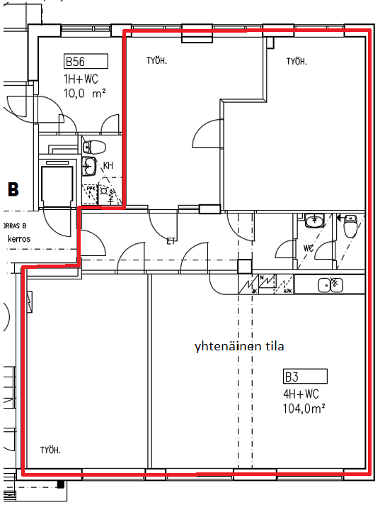 Ensimmäisen toimistotilassa on yhteensä neljä (4) toimistohuonetta ja WC. Huoneista on kolme pienempää on kooltaan noin 15 - 20 m² ja yksi noin 35 m², mihin on sijoitettu keittiö.