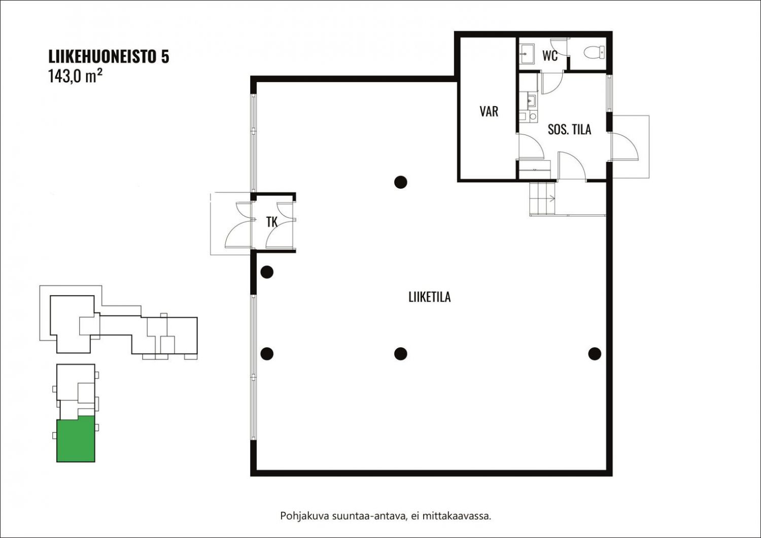 Tilassa on isot näyteikkunat kadulle päin, mikä antaa hyvän näkyvyyden. Tila soveltuu hyvin esim. hyvinvointipalveluiden tuottajalle, kokoontumistilaksi, parturi-kampaamoksi tai erikoistavaraliikkeeksi. Tilassa on aikaisemmin toiminut eläinlääkärin vastaanotto. Tila on nyt jaettu eri kokoisiin huoneisiin, mutta se on yhdistettävissä yhdeksi isoksi tilaksi. Keittiö, varasto ja tauko sekä wc tilat on tilan takaosassa, mistä on myös kulku sisäpihalle. Lisäksi toimistohuoneissa on kahdessa on minikeittiö.
