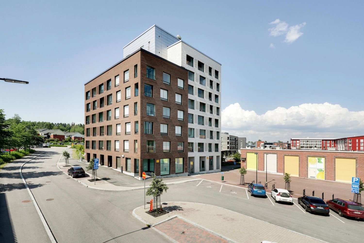 Lyhytaikaisia asiakaspysäköintipaikkoja talon edessä.