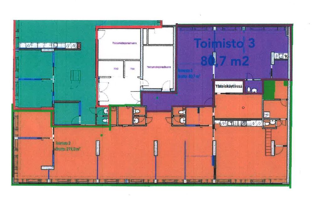Kokonaisuus koostuu 80,7 m² (pohjakuva nro 3) ja 219 m² (pohjakuva nro 2). Tilat voidaan vuokrata yhdessä tai erikseen. Isompi tila koostuu avotilasta sekä muutamasta huoneesta ja avokeittiöstä, jossa on runsaasti kaappitilaa. Toimistossa on myös oma kylpyhuone ja sauna. Pienemmässä tilassa on oma keittiö ja wc.