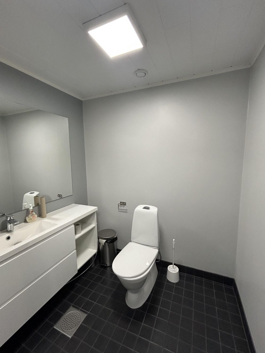 Pienempi kokonaisuus: Keittiö, 1 wc + suihku ja viisi toimistohuonetta, varasto ja tekninen tila.