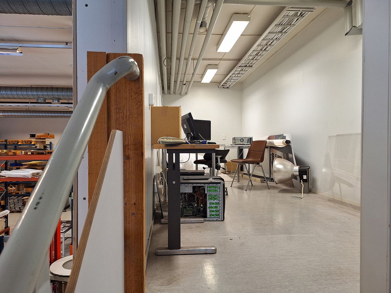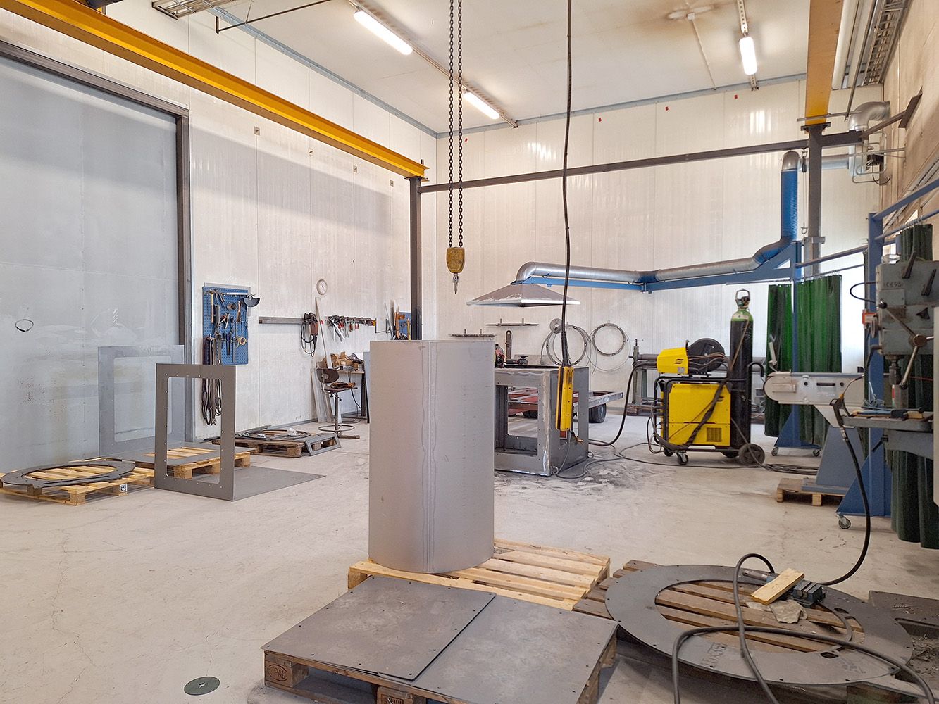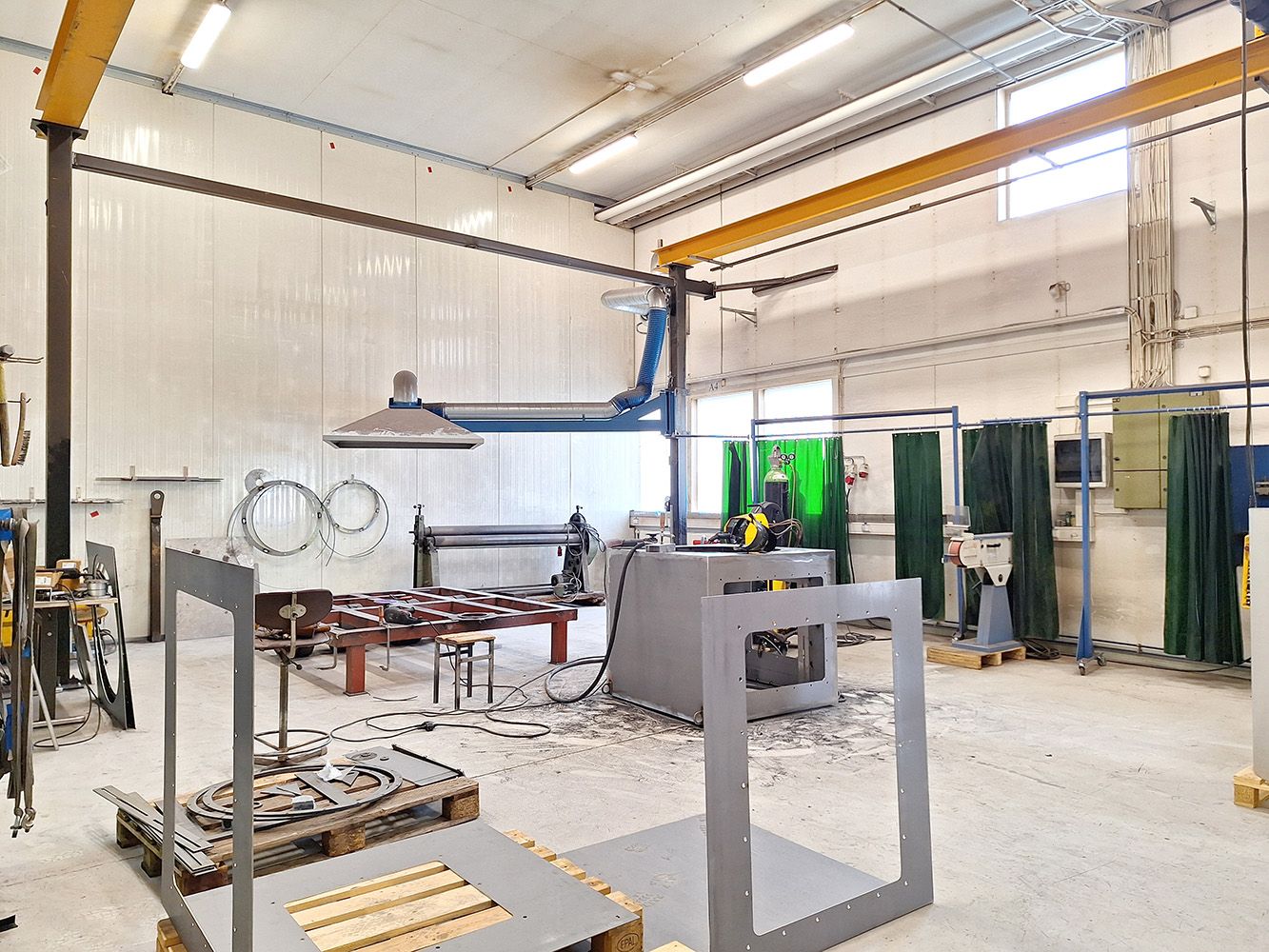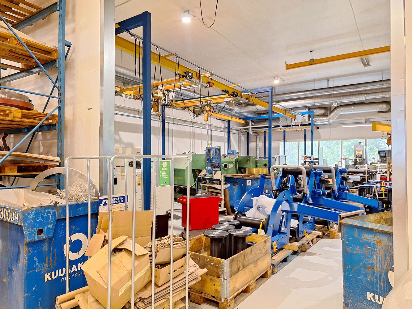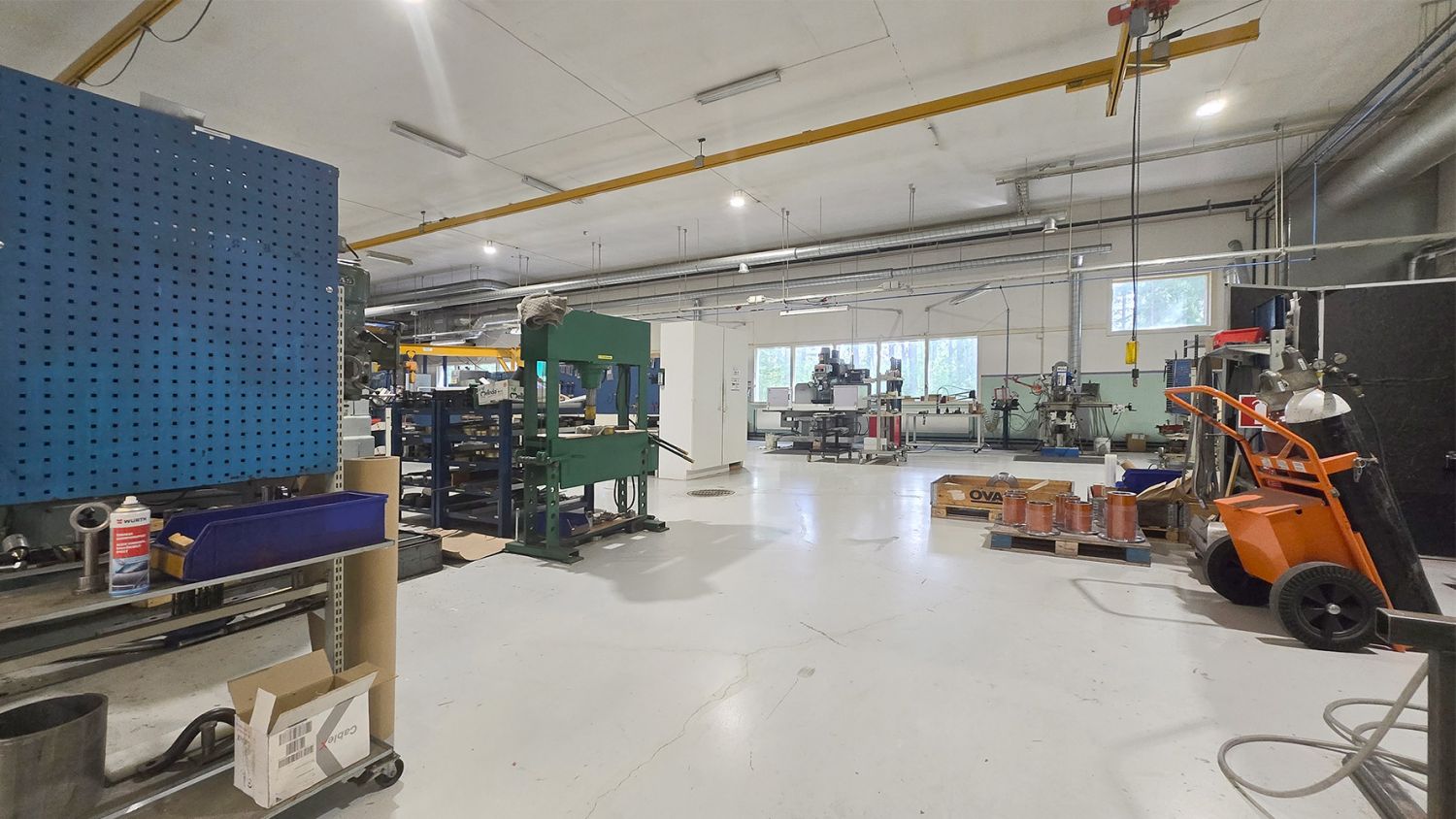 Tilassa tällä hetkellä 5 t siltanosturi, kiinteä ketjunostin sekä toimintavalmis erillinen tila hitsaustöitä varten vuokralaisen käytössä. Nosturit ovat tarkastettu ja tyypitetty. Hallissa on lisäksi paineilmaverkosto sekä erillinen tila kompressorille. Vuokralainen vastaa tarvittaessa kompressorin hankkimisesta.