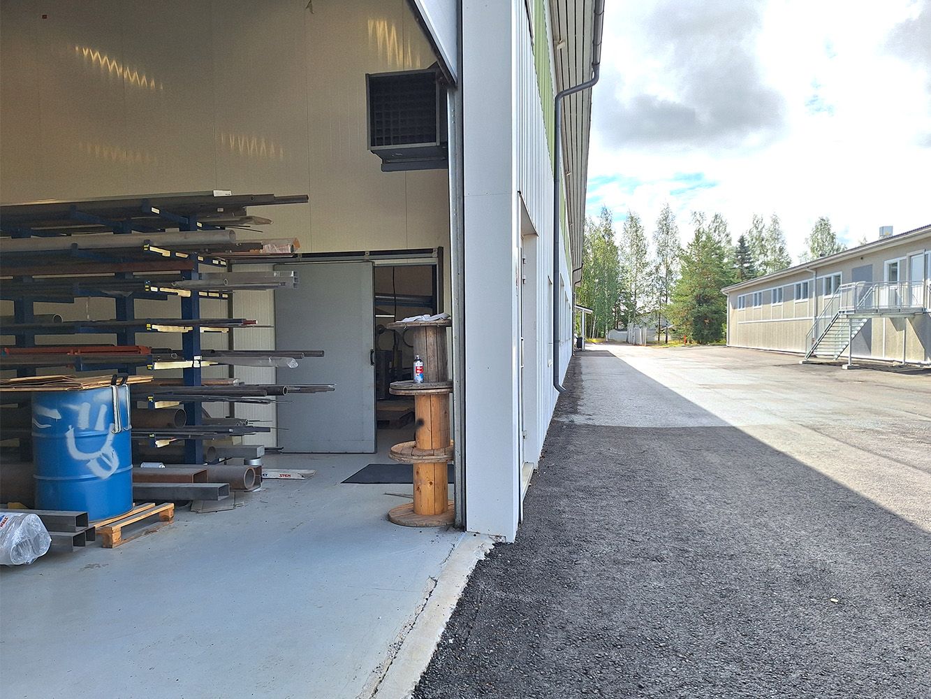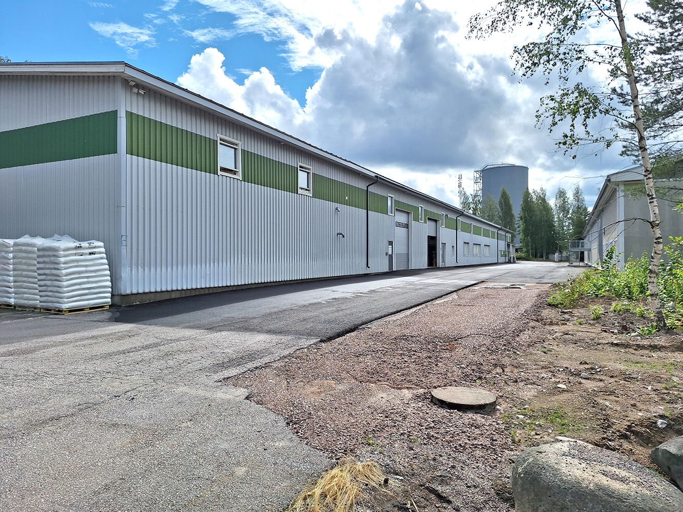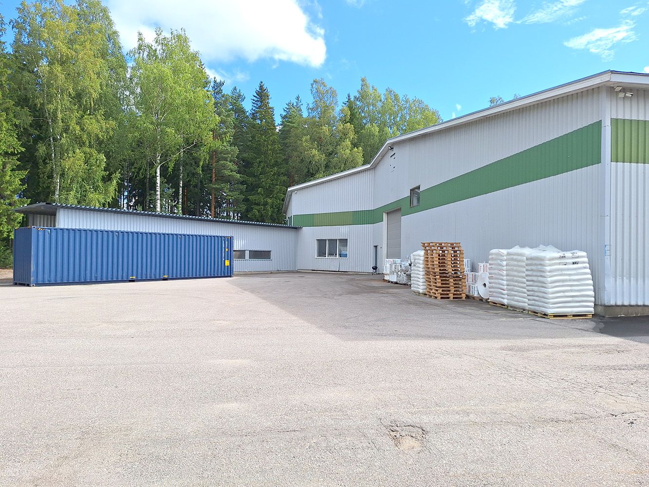 Rakennus ei ole ympäriajettavissa, mutta etupihalla mahtuu hyvin isompikin yhdistelmä kääntymään. Lisää pihatilaa löytyy rakennuksen toisesta päädystä. Piha-alueet ovat asfaltoidut ja talvella auraus sisältyy vuokraan. Oma ajoportti, mutta koko piha-aluetta ei ole aidattu.