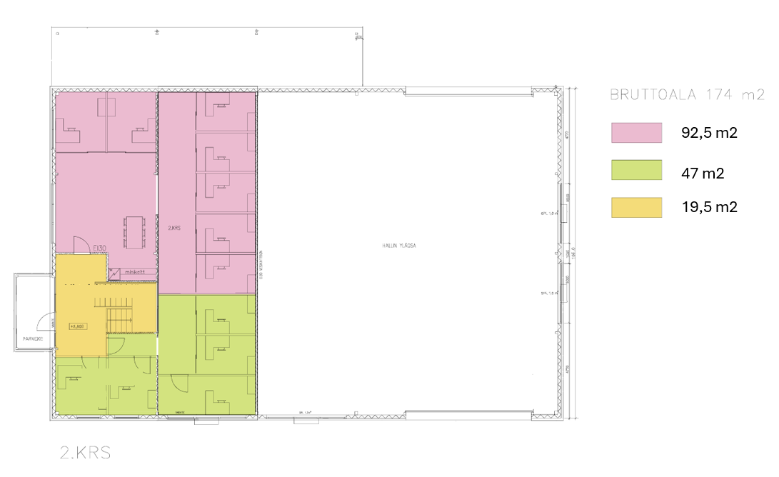 Toimistotilaa kohteessa on n. 47 m2. Toimistotilat ovat toisessa kerroksessa, jossa viisi toimistohuonetta ja ilmalämpöpumppu.