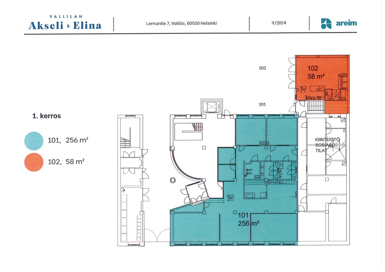 1. kerroksen pientoimistotila 256 m² (pohjapiirustuksessa tila 101).