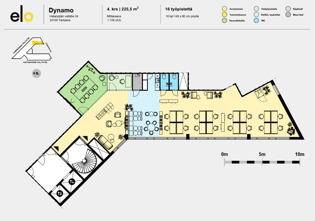 Nykyaikainen ja muuntojoustava toimistotila Dynamo Business Parkissa Tampereen Ratinassa. Tila sijaitsee kiinteistön 4. kerroksessa. Tilassa on uusittu keittiö, mutta muuten tila on vielä lähes alkuperäisessä asussaan. Muutostyöt Dynamossa ovat kuitenkin helppoja ja ne toteutetaan ammattitaitoisesti. Voit siis vuokrata tilan nykyisessä muodossaan tai suunnitella sen omien tarpeiden mukaiseksi kokonaisuudeksi. Ota yhteyttä, niin autamme suunnittelun alkuun!