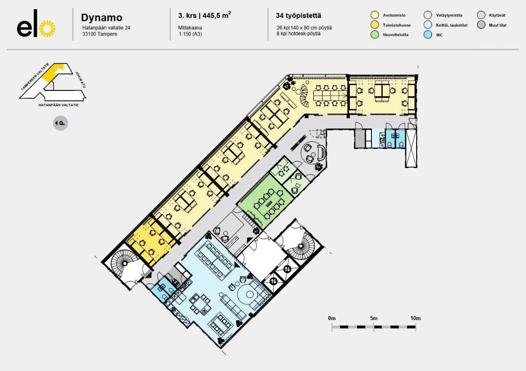 Kiinteistön 3. kerroksessa sijaitseva nykyaikainen ja laadukkaasti remontoitu toimistotila. Toimistossa on tilava, kodinomainen keittiö, jossa on muun muassa uuni, liesi ja saareke. Tilaa rytmittävät lasiseinät ja lasiliukuovet, jotka tuovat avaruutta ja valoa. Pohjakuva vastaa tilan nykyistä muotoa, kalustus on esimerkinomainen.