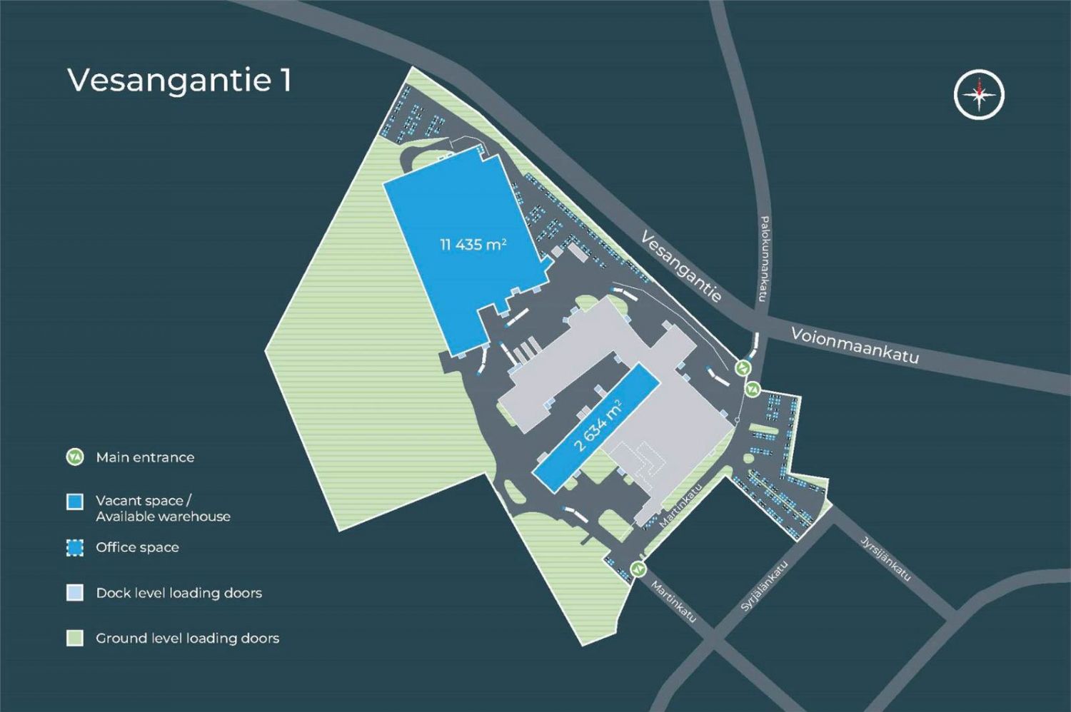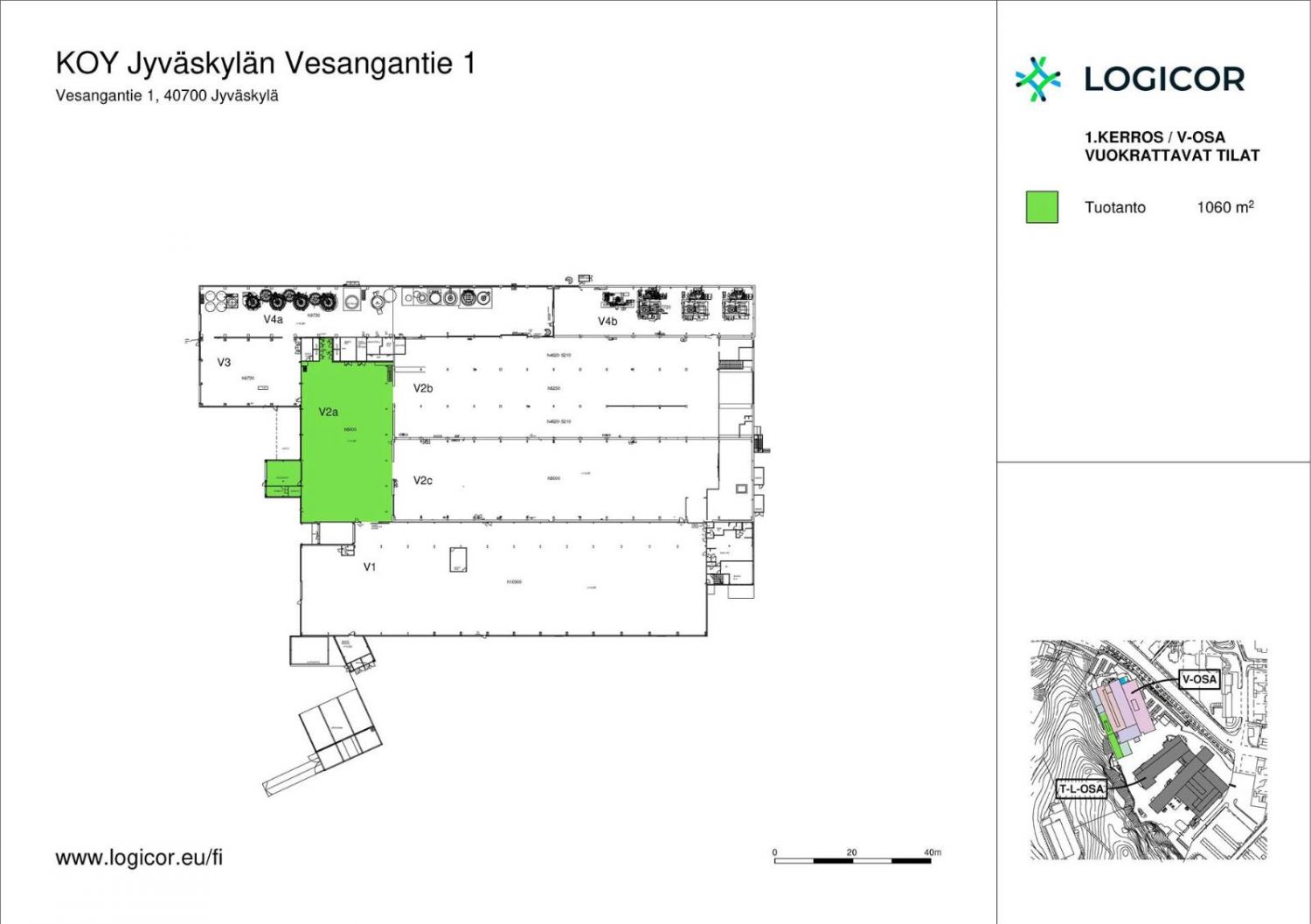 Vuokrattavana 1 060 m² tuotantotila (V2a), johon on yksi maantason nosto-ovi. Tila on helppo yhdistää viereisiin tiloihin ja vuokrata laajempi tilakokonaisuus (tilat 2a-c) omat toimisto- ja sosiaalitilat huomioiden. Tilan maksimikorkeus on noin 8 metriä.