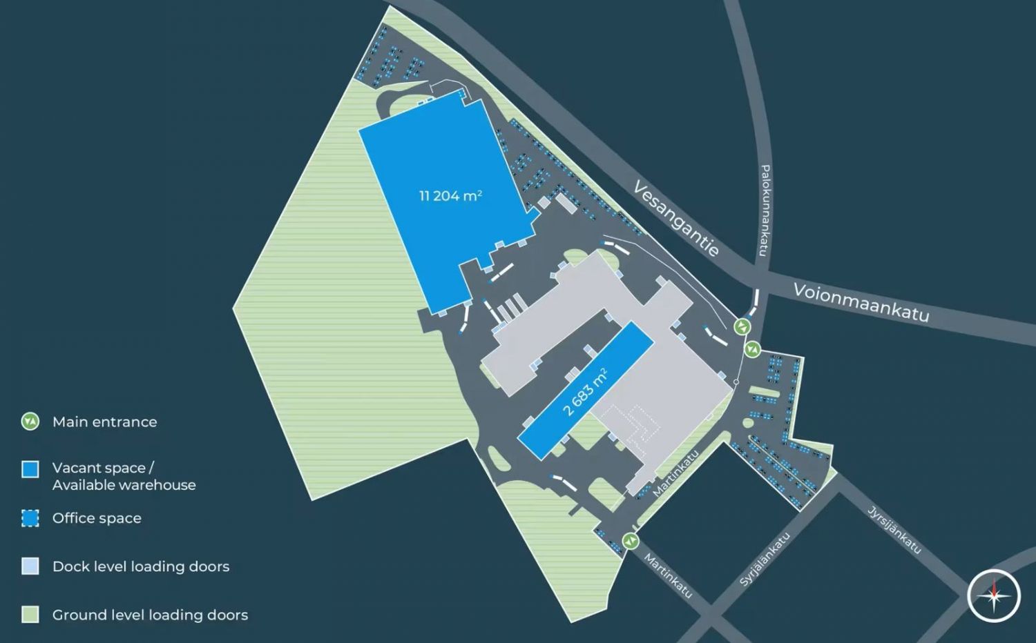 Varastotilojen vapaa korkeudet löytyy pohjakuvasta ja kaikissa tiloissa on hallinostin valmiina. Pihassa on tilaa täysperävaunun pyörähdellä ja henkilökunnan autotkin mahtuvat tontille hyvin.