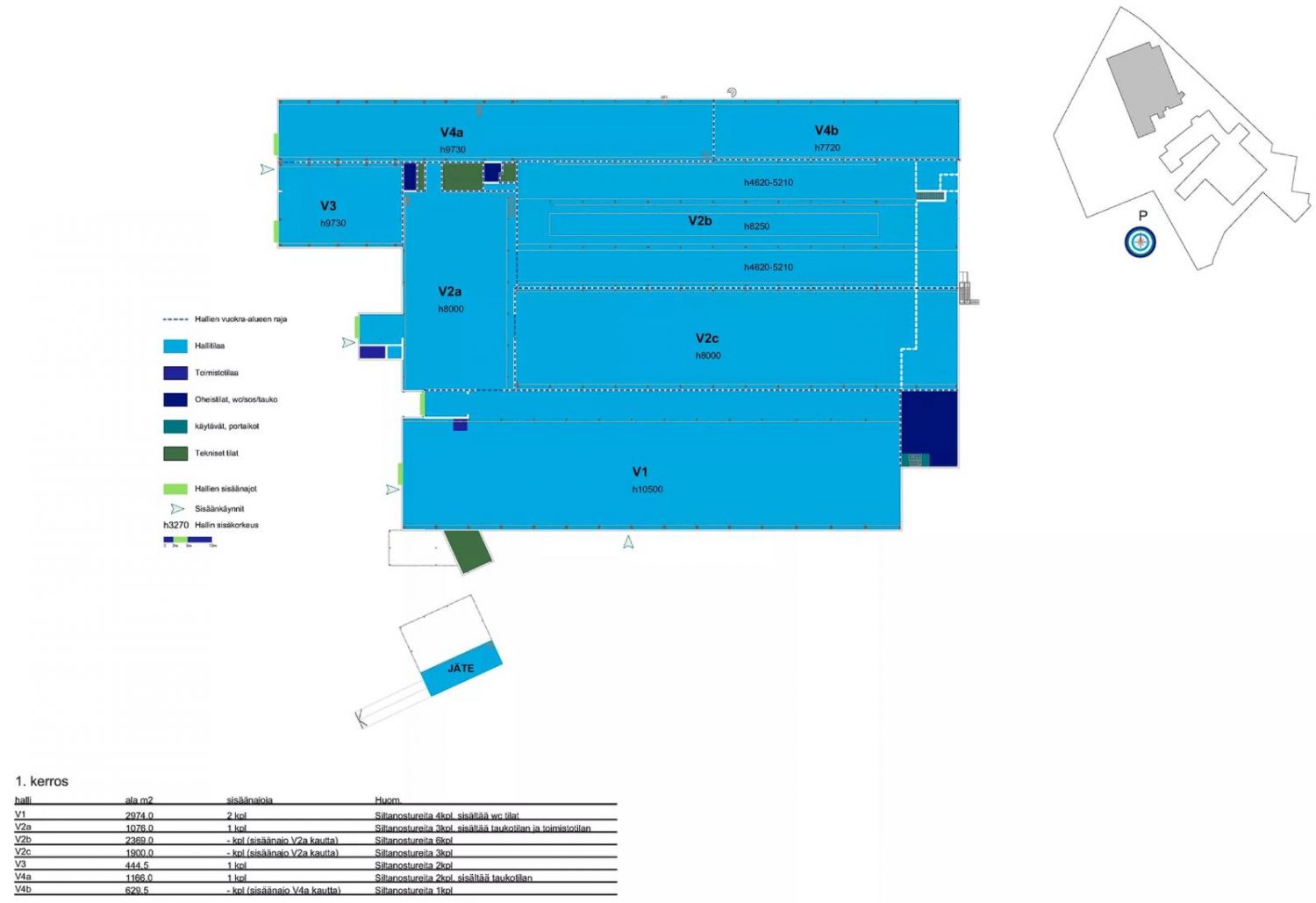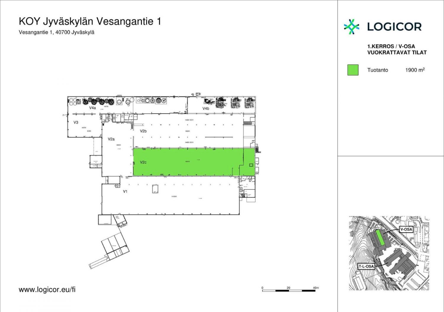 Vuokrataan Jyväskylän Rautpohjasta 1 900 m² varasto-/tuotantotila. Pohjakuvassa tunnus V2c, jonka välittömässä läheisyydessä sisäyhteydellä on vuokrattavissa myös toimisto- ja sosiaalitilat henkilökunnan tarpeisiin. Tähän tilaan on mahdollista toteuttaa maantason nosto-ovet tai vuokrata laajempi tilakokonaisuus (V2a-c), jossa on valmiina maantason nosto-ovet. Tilan maksimikorkeus vaihtelee alueittain noin 4,5-8 metrin välillä.