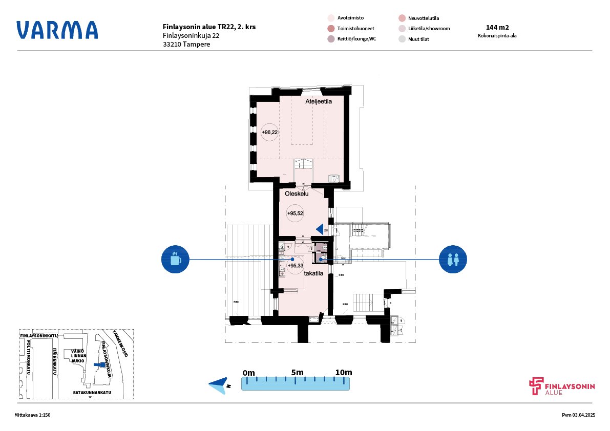 Perinteikäs Finlaysonin alue on vireä liike-elämän, vapaa-ajan ja kulttuuritapahtumien keskus, jossa toimivissa yli 100 yrityksessä työskentelee ja asioi päivittäin tuhansia ihmisiä. Alueen useat ravintolat ja kahvilat mahdollistavat maukkaat lounas- ja kahvihetket. Finlaysonin alueen vanhat tehdasrakennukset tarjoavat yrityksellesi uniikin toimintaympäristön Tammerkosken maisemissa. Alueen rakennukset ovat BREEAM In-Use -ympäristösertifioituja arvosanalla Very Good. Finlaysonin alue on helposti saavutettavissa omalla autolla, julkisin kulkuvälinein ja kevyellä liikenteellä. Keskustori ja rautatieasema ovat kävelymatkan etäisyydellä. Persoonallinen, korkea ateljeetila lankkulattioineen. Oma sisäänkäynti. Tila näkemisen arvoinen.
