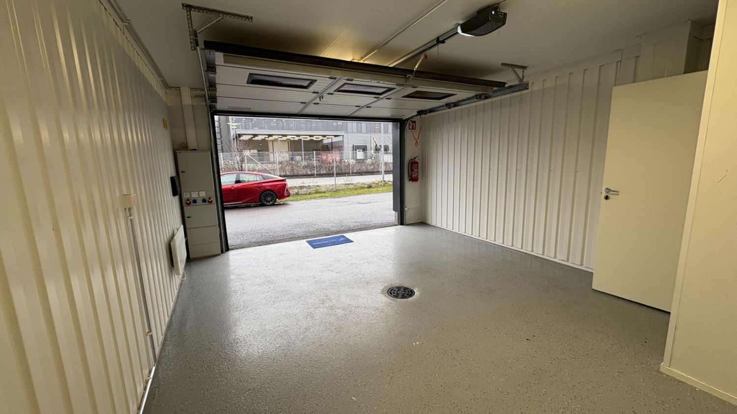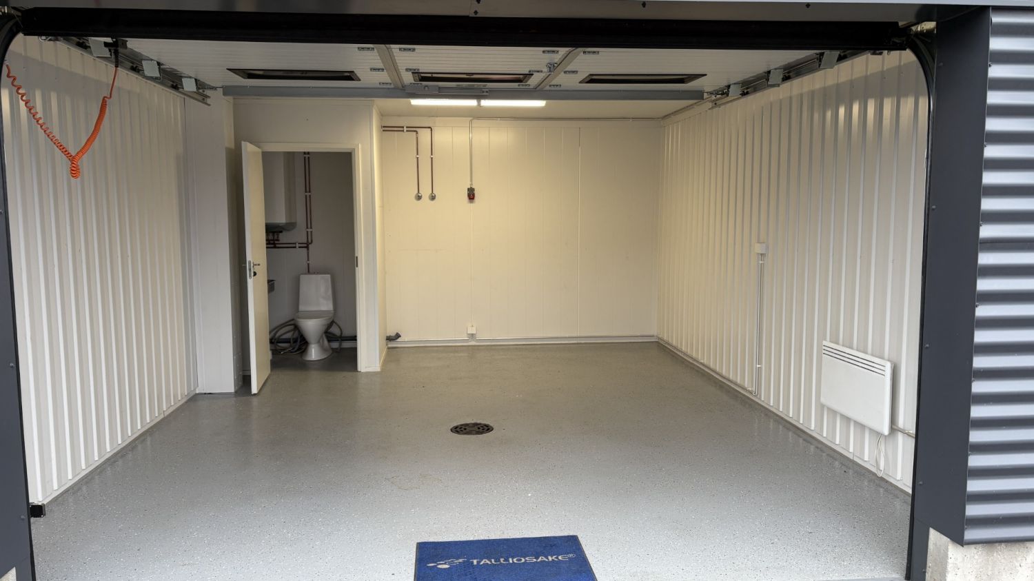 Moottoroitu nosto-ovi erillisellä käyntiovella. Autolla sisään ajettava tila. Tilamitat: 5,65 (Pituus) 4,40 (Leveys) 2,50 (Korkeus). Ovimitat: 3,35 (Leveys) 2,20 (Korkeus).