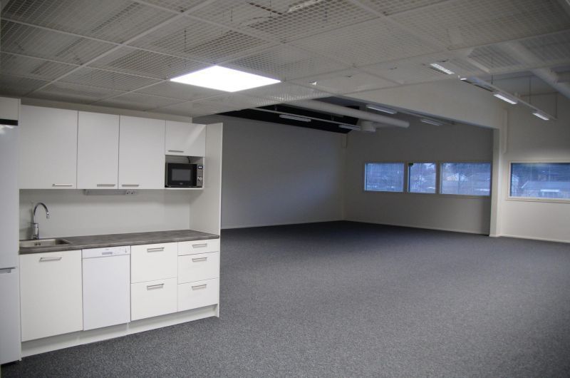 Tilassa minikeittiö ja akustoiva tekstiilimattolattia.