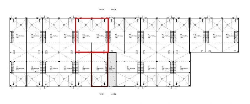 Tila A11â12 on kooltaan 192 m² ja soveltuu erinomaisesti esimerkiksi työ-, tuotanto- tai varastokäyttöön. Halutessa tilaan on mahdollista liittää viereinen B7-osio, jonka pinta-ala on 96 m². Tilan suunnittelussa on huomioitu muunneltavuus, joten se mukautuu monenlaisiin käyttötarkoituksiin. Tilassa oleva parvi on myös mahdollista purkaa.