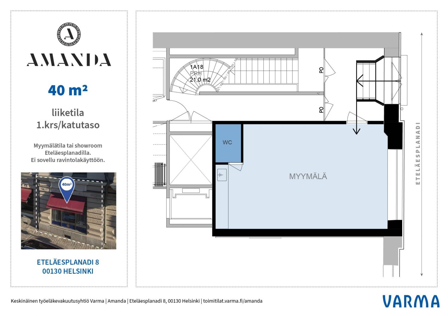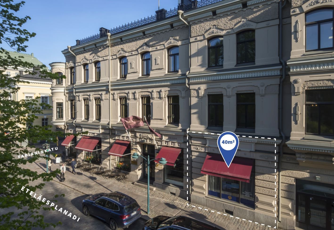 Kohteen projektivuokrausta hoitaa JLL Finland: Terhi Kivekäs, 050 365 8603, terhi.kivekas@jll.com / Pekka Issakainen, 050 390 0090, pekka.issakainen@jll.com. Pieni edustava katutason liiketila tai showroom Esplanadinpuoleisella näyteikkunalla. Ei omaa sisäänkäyntiä kadulta, kulku tilaan kiinteistön yhteisen aulan kautta. Ei sovellu ravintolakäyttöön / not suitable for restaurant use.