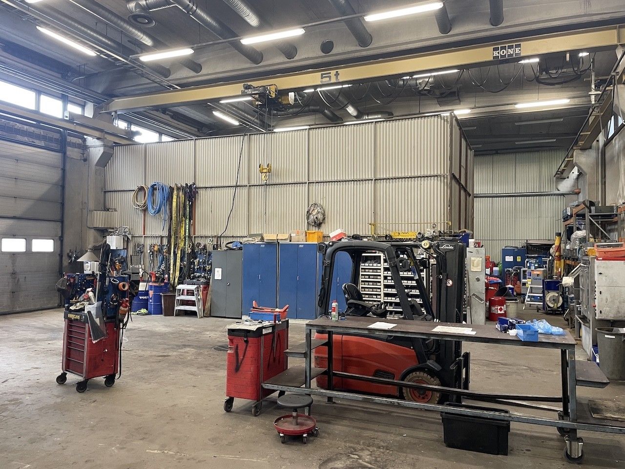 Hallin vapaa korkeus on 6,3 metriä. Tilassa on neljä nosto-ovea (koko 4,5 m x 4,5 m), lattiakaivot hiekan- ja öljynerottimilla sekä erillinen pesupaikka. Lisäksi käytettävissä on 5 tonnin kattonosturi, korkeus nosturin runkoon on 5,95 metriä.