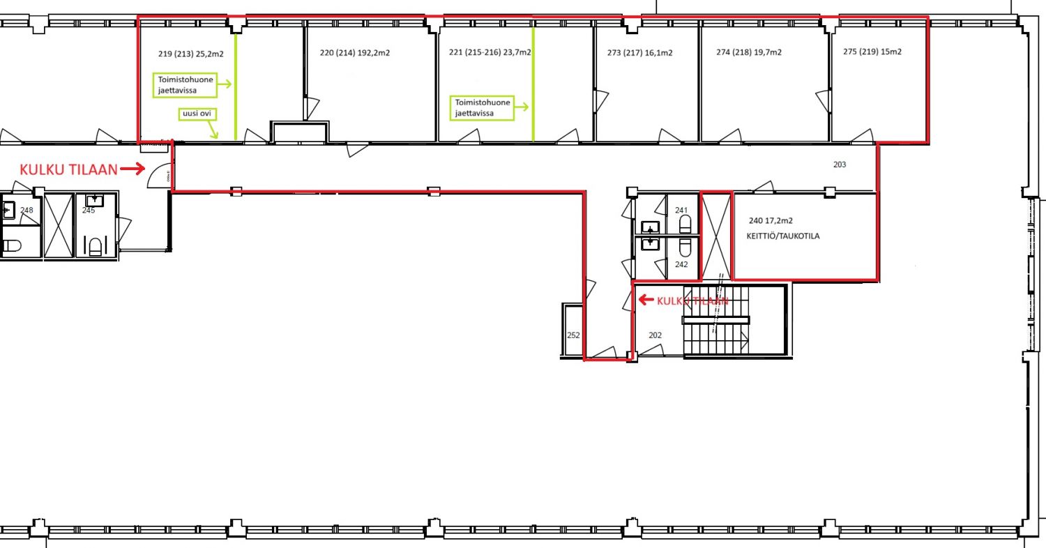 Tilassa 6 toimistohuonetta (15m2-25m2), keittiö/neuvottelutila n. 17m2 ja wc-tilat.