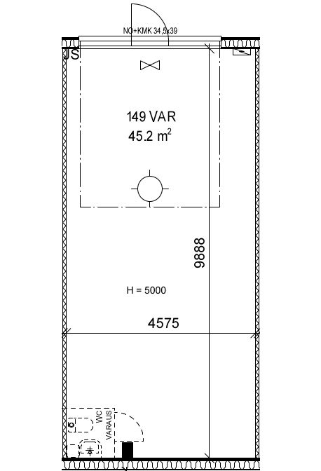 Autolla sisään ajettava tila. Tilamitat: 9,85 (Pituus) 4,55 (Leveys) 5,00 (Korkeus). Ovimitat: 3,45 (Leveys) 3,90 (Korkeus).