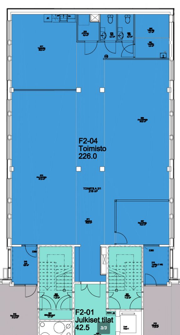 Vuokrattava pinta-ala on 216 m² (+ jyvitetyt sosiaalitilat 3 m²).