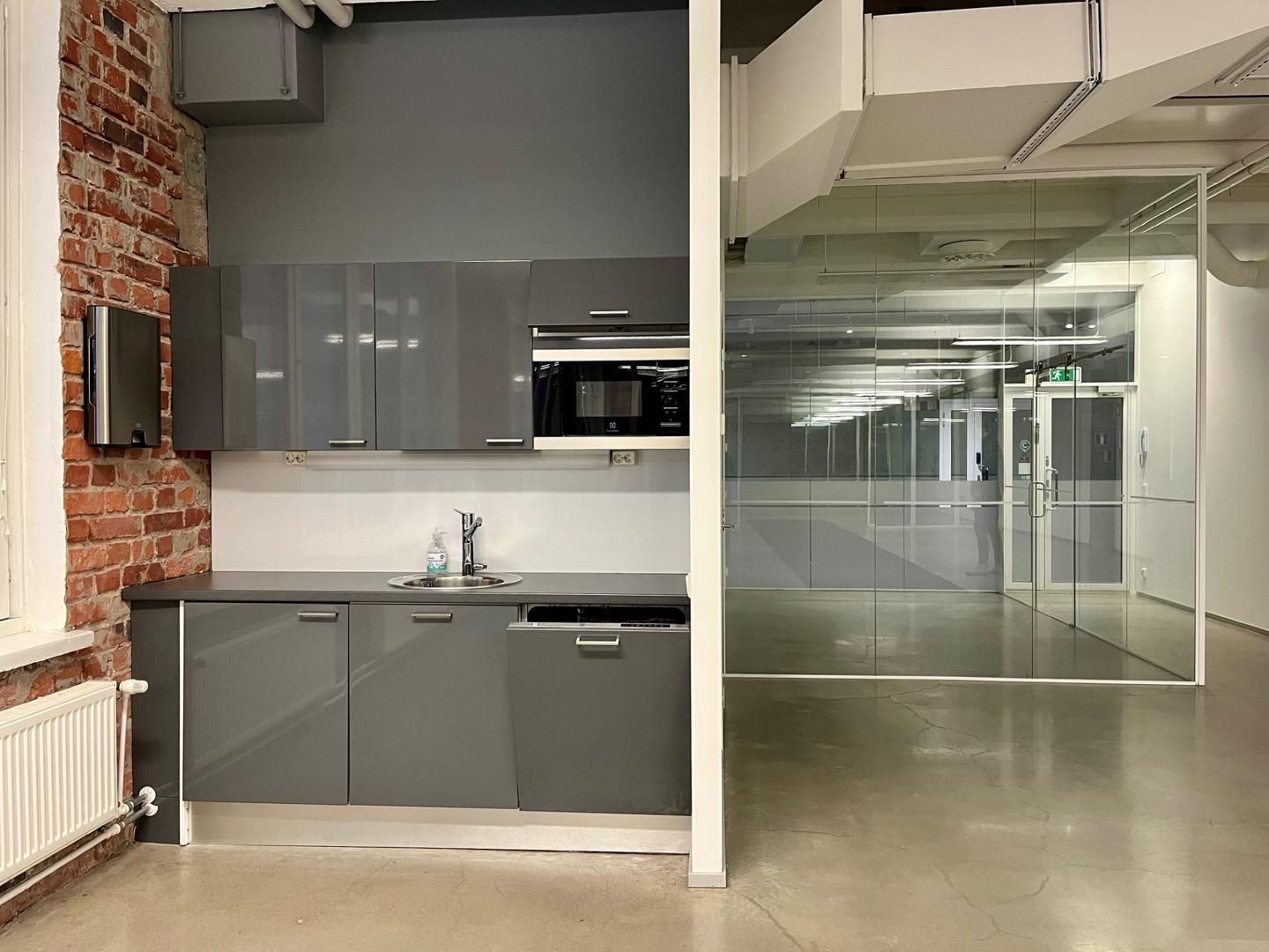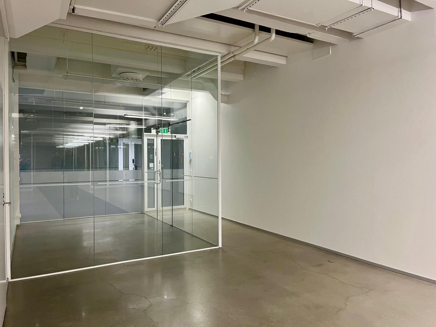 Sisäänkäynti tilaan on kiinteistön aulasta, jonne tila rajautuu lasiseinin ja ovin.