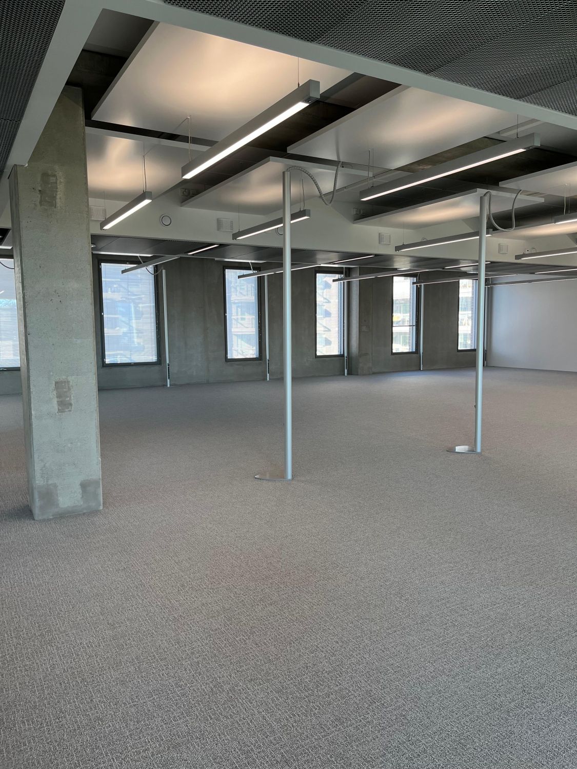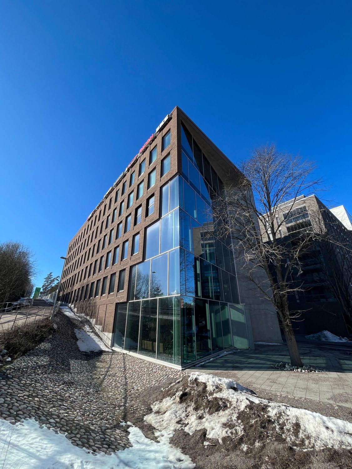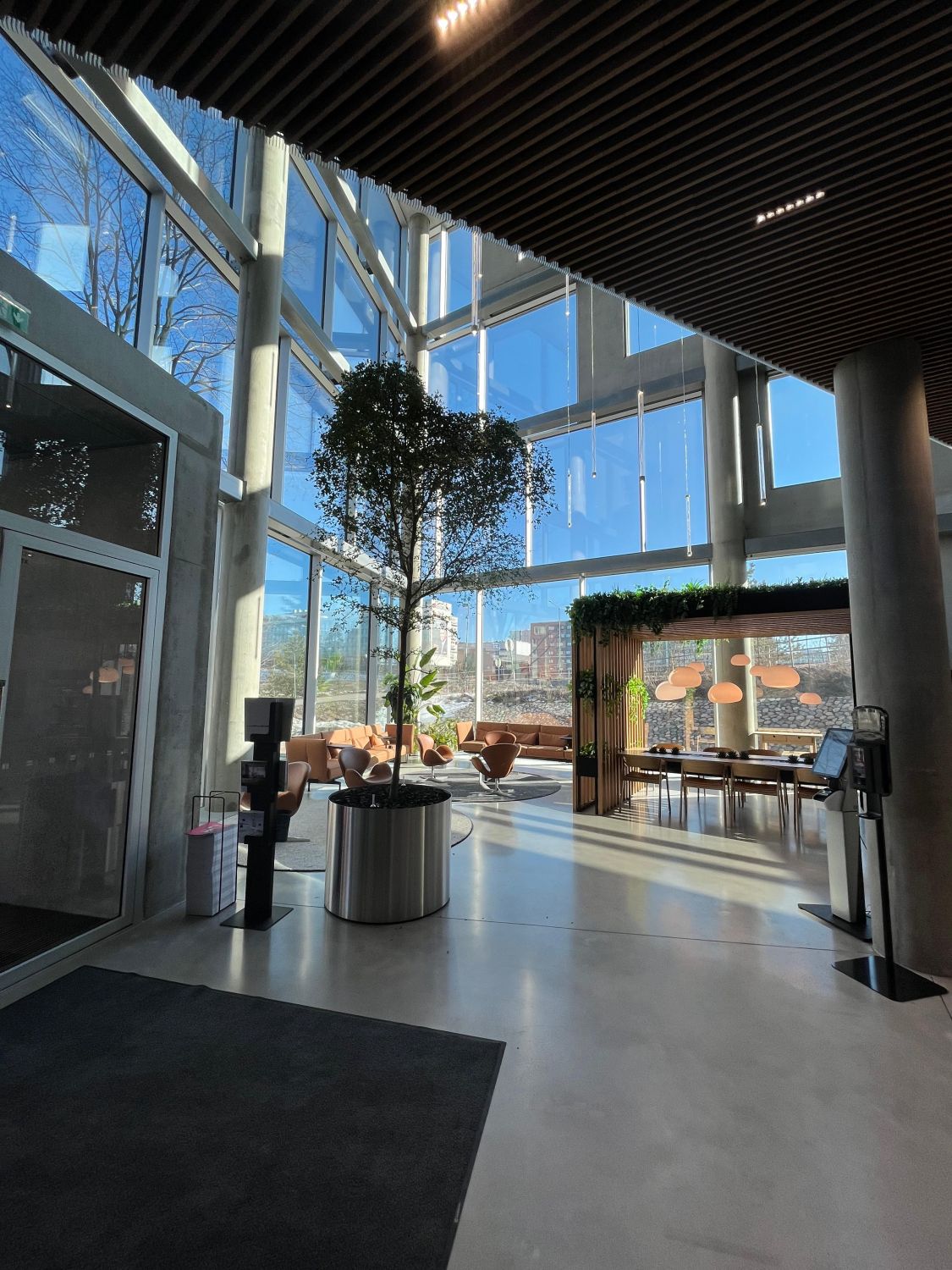 Iso Omena ja muu Matinkylä näkyy valoisista ikkunoista. Ennen työpäivää tai sen jälkeen (miksei kesken päivänkin) voi käydä ylimmän kerroksen kuntosalissa treenaamassa samalla kuin vaikkapa oma sähköauto latautuu paikallaan. Aulapalvelu ottaa vieraat vastaan ja tyylikkäät vuokrattavat kokoushuoneet löytyvät sisääntulokerroksesta.