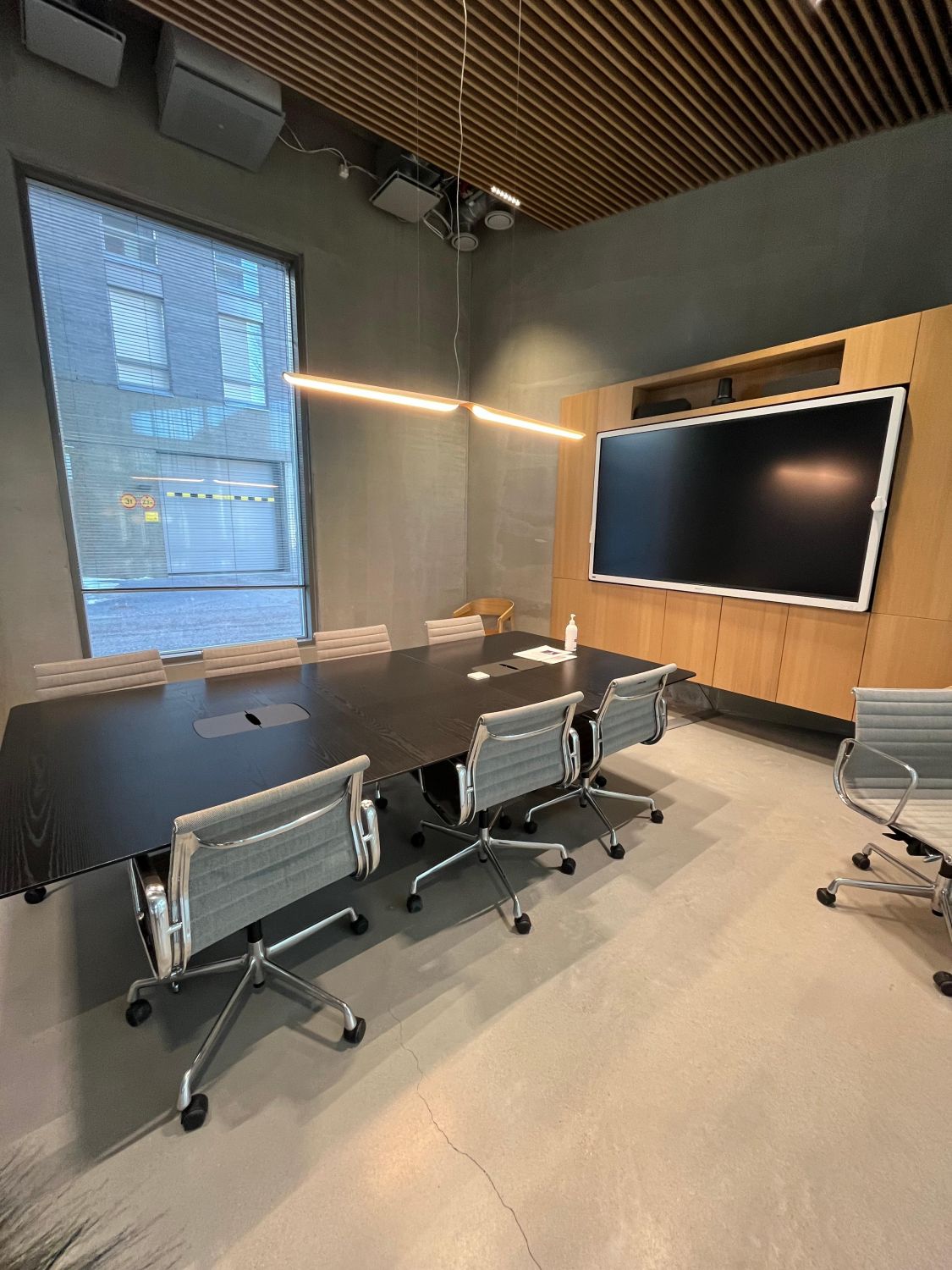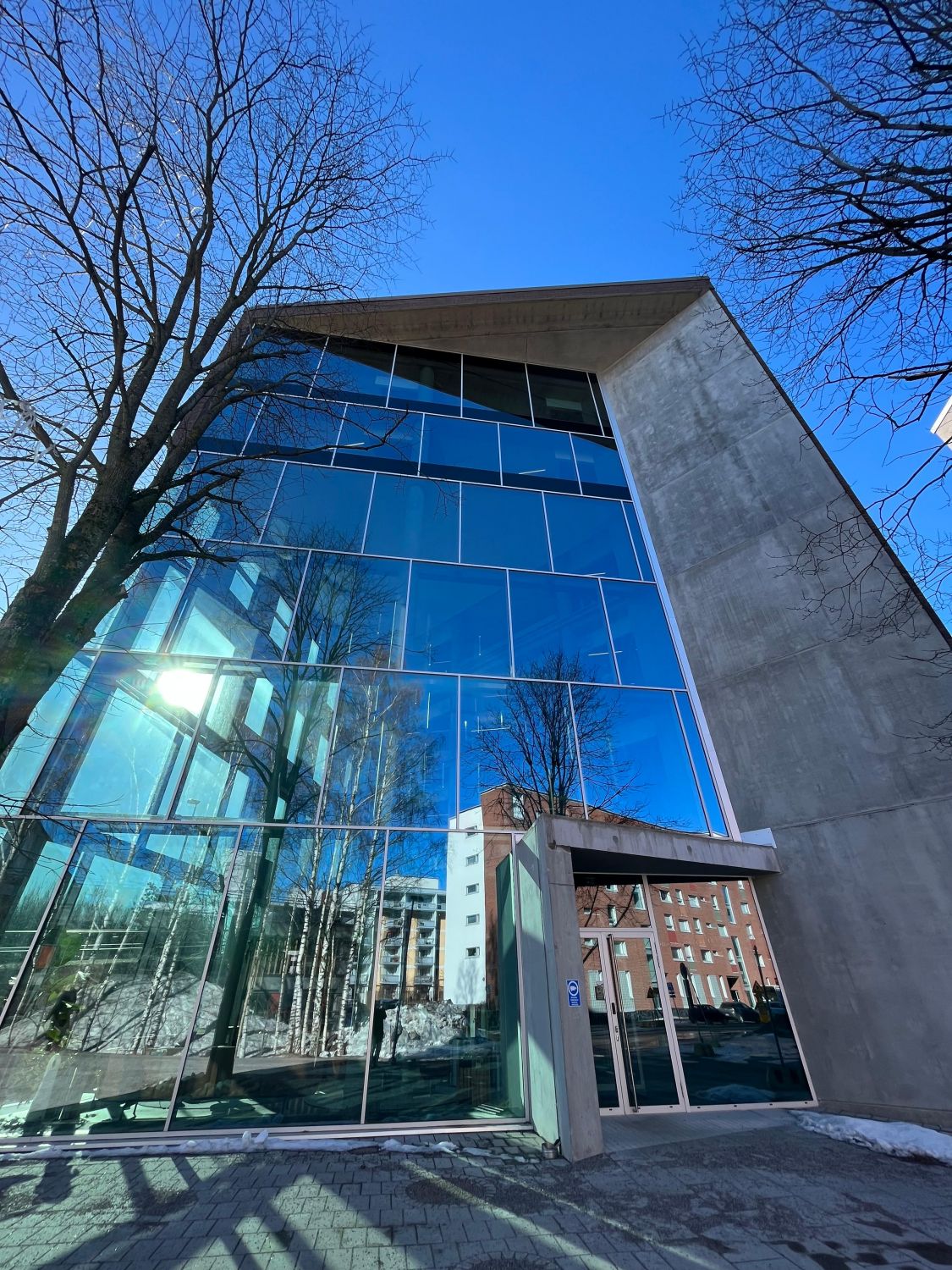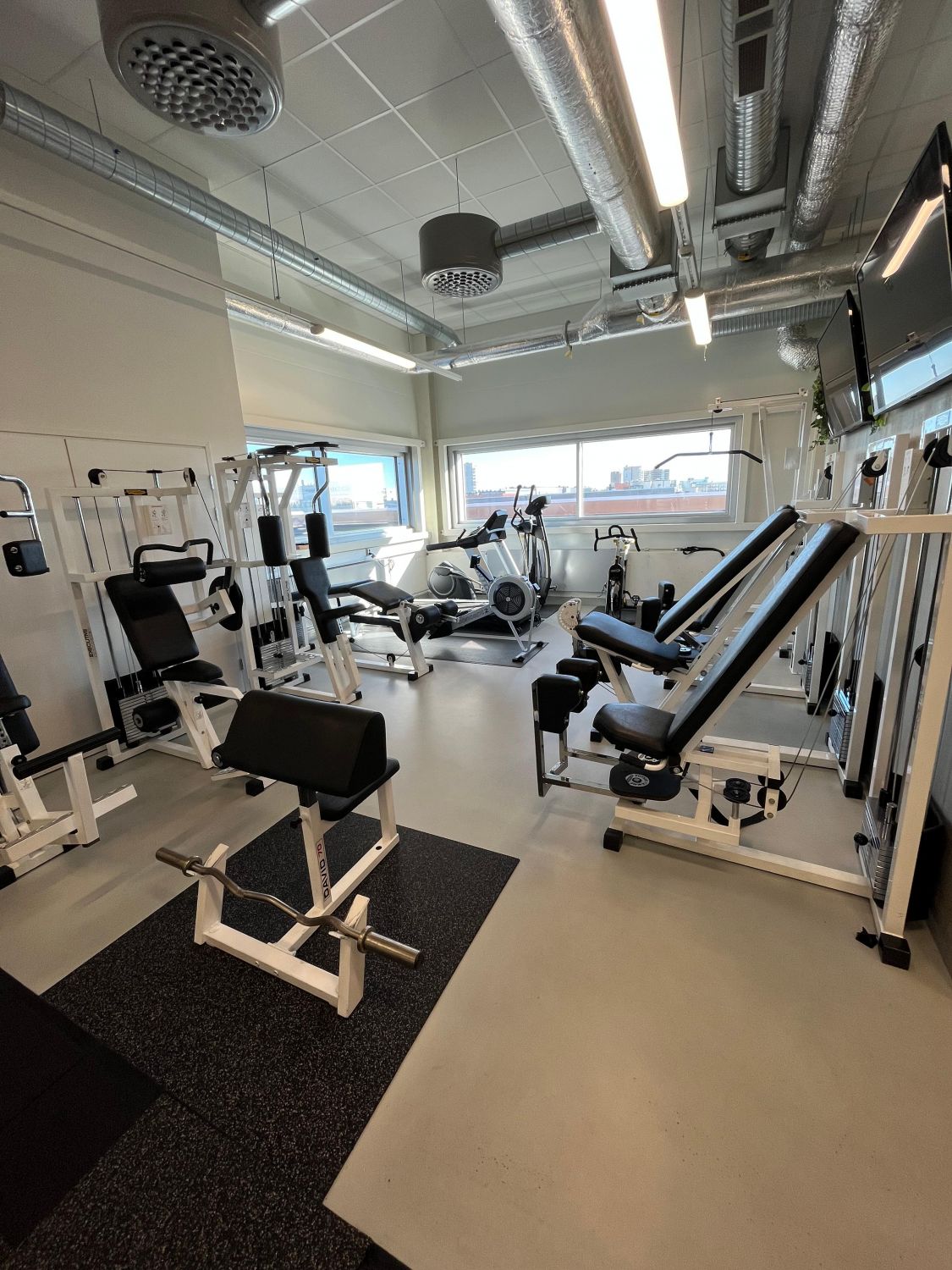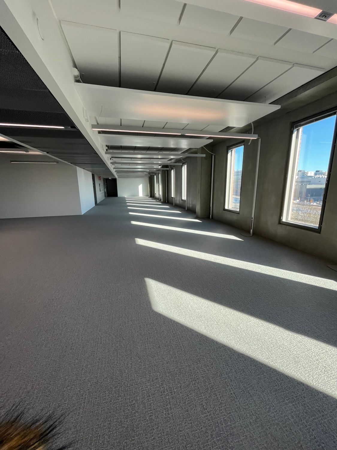 Iso Omena ja muu Matinkylä näkyy valoisista ikkunoista. Ennen työpäivää tai sen jälkeen (miksei kesken päivänkin) voi käydä ylimmän kerroksen kuntosalissa treenaamassa samalla kuin vaikkapa oma sähköauto latautuu paikallaan. Aulapalvelu ottaa vieraat vastaan ja tyylikkäät vuokrattavat kokoushuoneet löytyvät sisääntulokerroksesta.