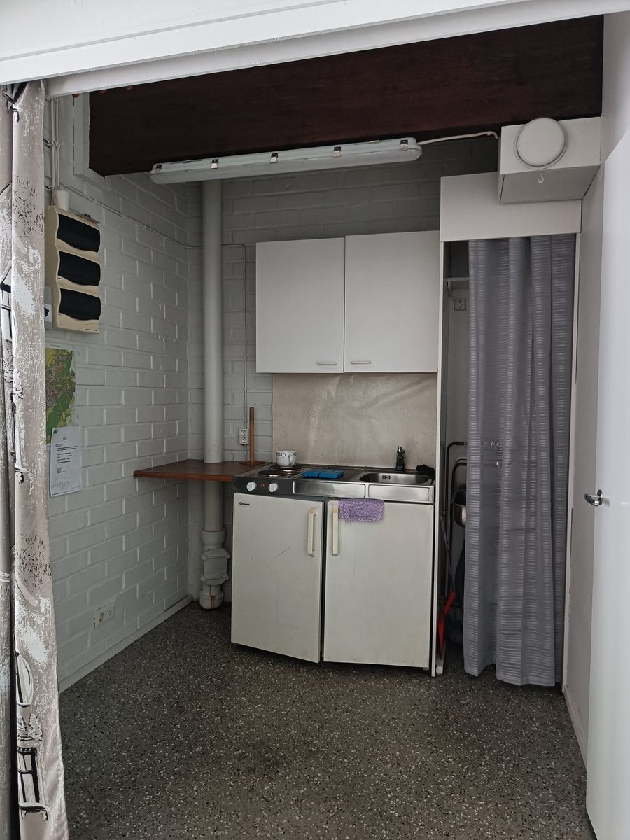Jääkaappi, pesuallas ja siivousallas.