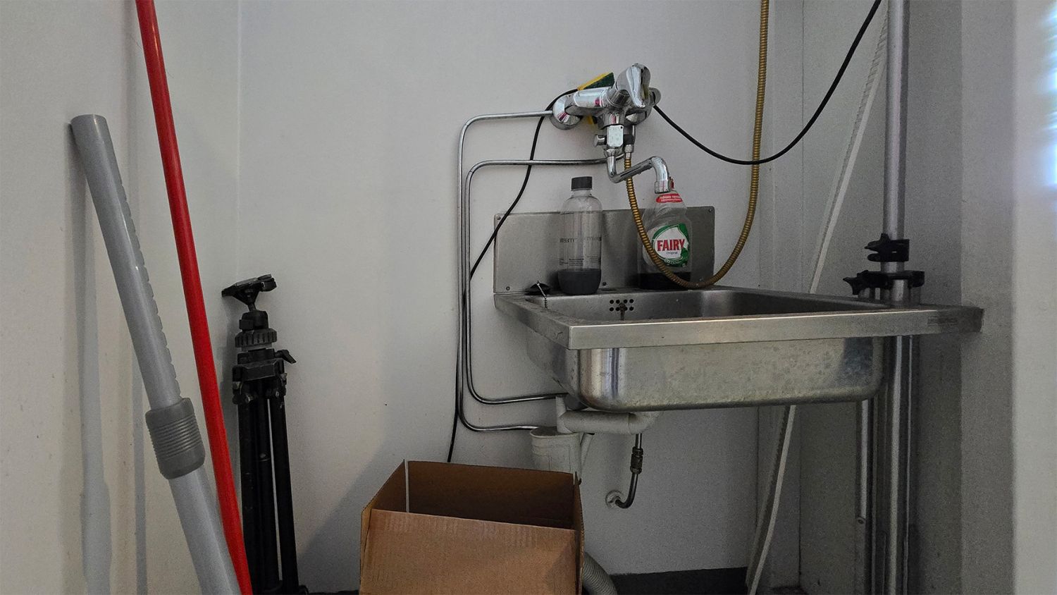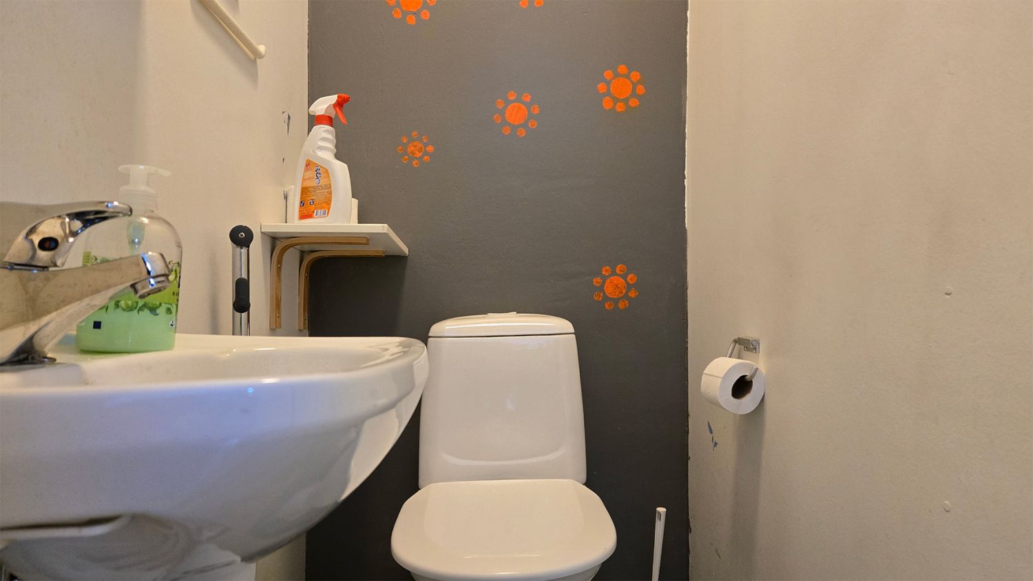 Tilassa on wc-tila ja suihku/siivouskomero. Paikka pienelle keittiölle, missä nyt rst-kaatoallas. Viilennykseen on vanha ilmalämpöpumppu. Tilaan kulku kulmasta ja takapihalta pariovesta.