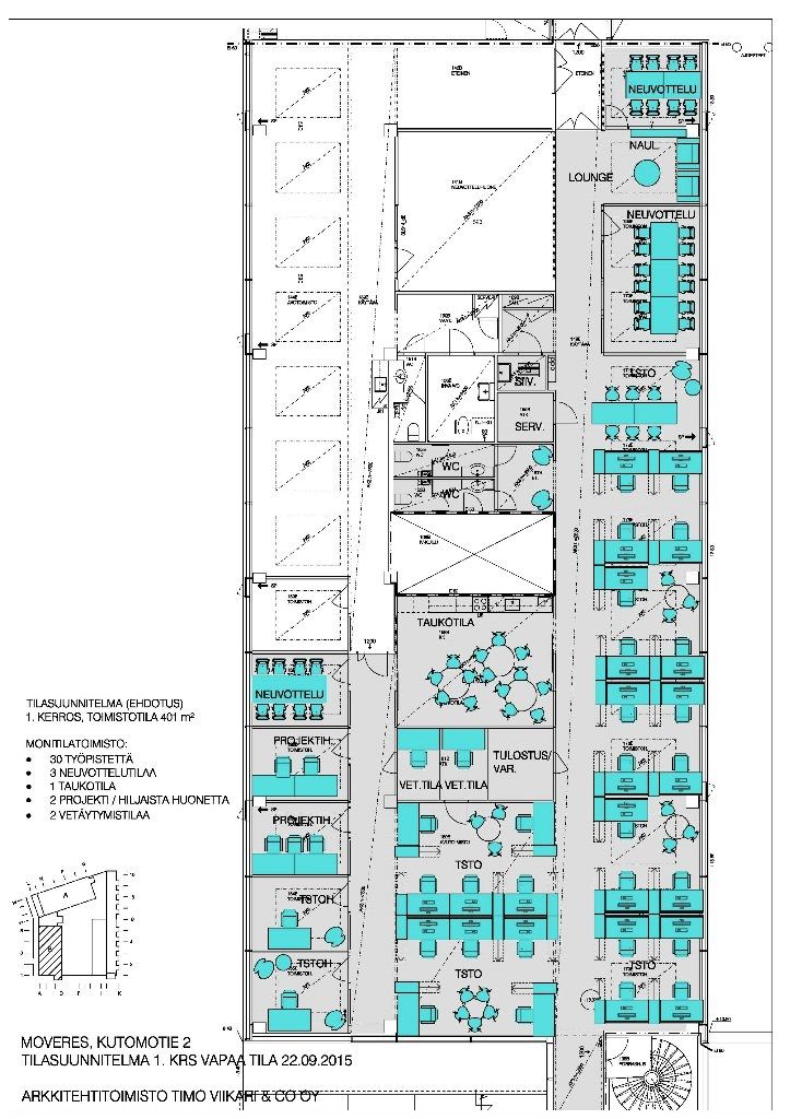 Moveres Business Park. Moderni ja edustavaa toimistotila neljännessä kerroksessa, johon mahdollista asettaa työpisteet n. 30 henkilölle omissa työhuoneissa ja avokonttorissa. Huonejako on helppo säätää tulevan käyttäjän toiveiden mukaiseksi. Tarvittaessa huoneisto on myös mahdollista jakaa kahdelle eri käyttäjälle.