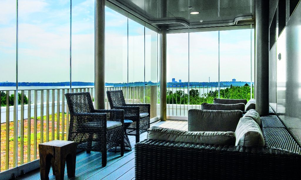 Viidennen kerroksen tyylikäs monitilatoimisto merinäköalalla.