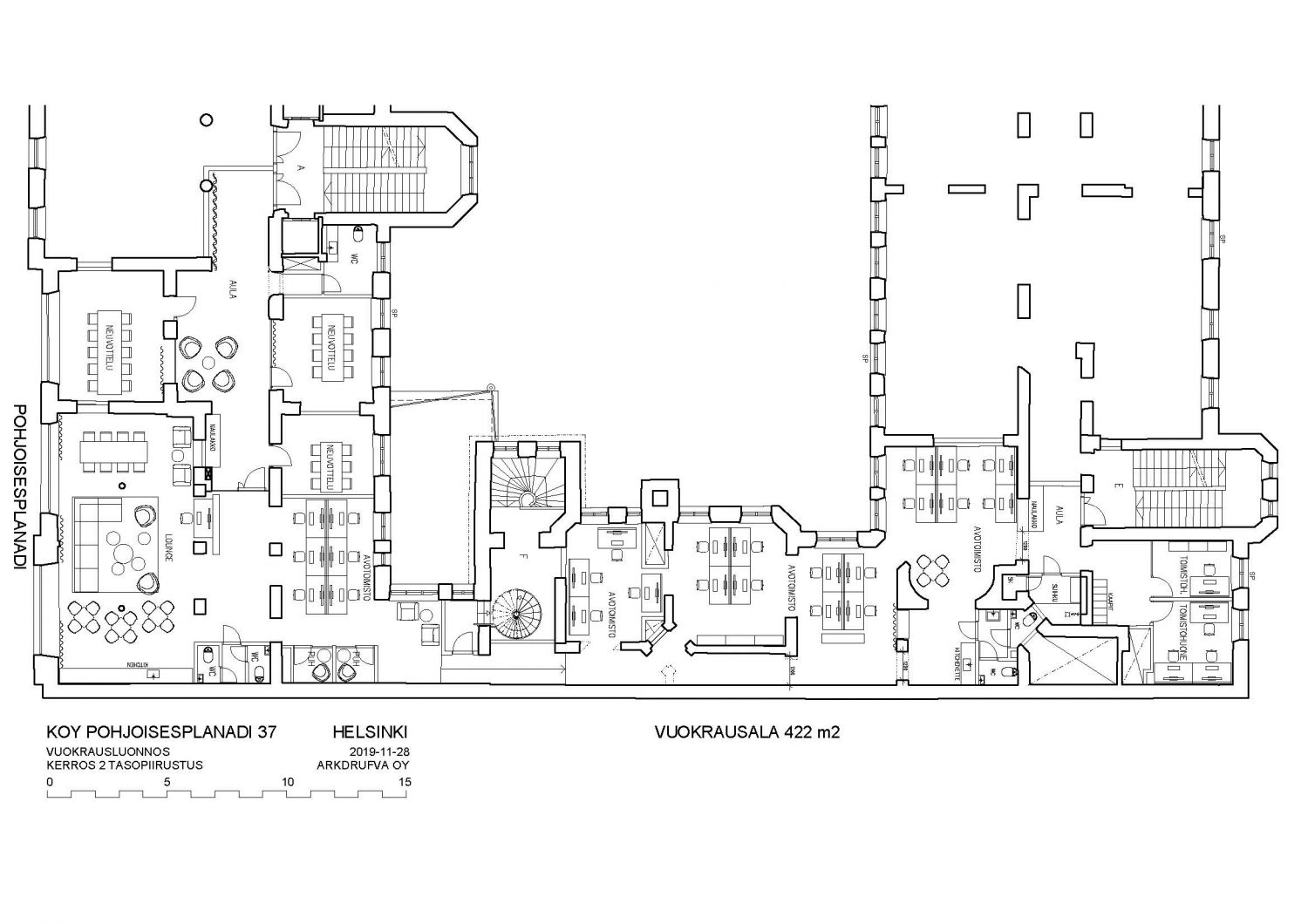 Vapaata toimistotilaa 2. kerroksessa. Pohjoisesplanadi 37 on Helsingin ydinkeskustan haluttu osoite liike-elämän, hallinnon ja kulttuurin kohtauspisteessä. Vilkas Esplanadi on parasta mahdollista ympäristöä menestyvälle yritykselle. Kaikki keskusta-alueen monipuoliset palvelut ovat lähettyvillä. Taidokkaasti saneeratussa arvokiinteistössä on tasokasta liike- ja toimistotilaa, seitsemän kerrosta ja kellaritilat. Tilat on jaettavissa toimistomoduulijaon mukaisiin tiloihin, joiden huoneistomuutokset on mahdollista toteuttaa vanhan rakennuksen ehdoin. Talo on saneerattu nykyaikaisen talotekniikan vaatimustason täyttäväksi. Lähin autoilijoita palveleva pysäköintihalli sijaitsee Kluuvissa, sisäänajo Kaisaniemestä tai Fabianinkadulta. Julkisen liikenteen yhteydet ovat vain lyhyen kävelymatkan päässä.