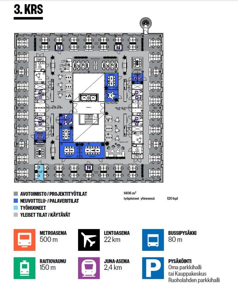Ruoholahden Ankkuri on moderni kiinteistö keskellä Ruoholahden toimistokeskittymää. Kiinteistölle on helppo tulla sekä julkisilla kulkuvälineillä että omalla autolla. Kiinteistön välittömästä läheisyydestä löytyvät Kauppakeskus Ruoholahden kaupalliset palvelut, liikuntapalvelut, työterveyspalvelut sekä Ruoholahden metroasema. Tämä vuokrattava toimistotila sijaitsee kiinteistön kolmannessa kerroksessa.