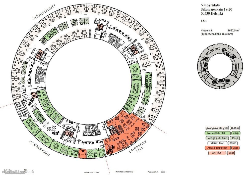 Oma viides kerros. Ympyrätalon ainutlaatuinen pohjaratkaisu tarjoaa monenlaisia tilamahdollisuuksia erikokoisille toimijoille. Kiinteistössä on kulun- ja kiinteistönvalvonta. Jäähdytystä voidaan ohjata tilakohtaisesti. Kaija ja Heikki Sirénin suuninttelema talo on kansainvälisesti tunnettu Helsingin maamerkki, josta on hyvät liikenneyhteydet helsingin keskustaan ja upeat maisemat Töölönlahdelle